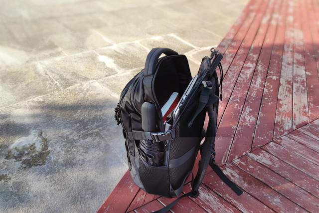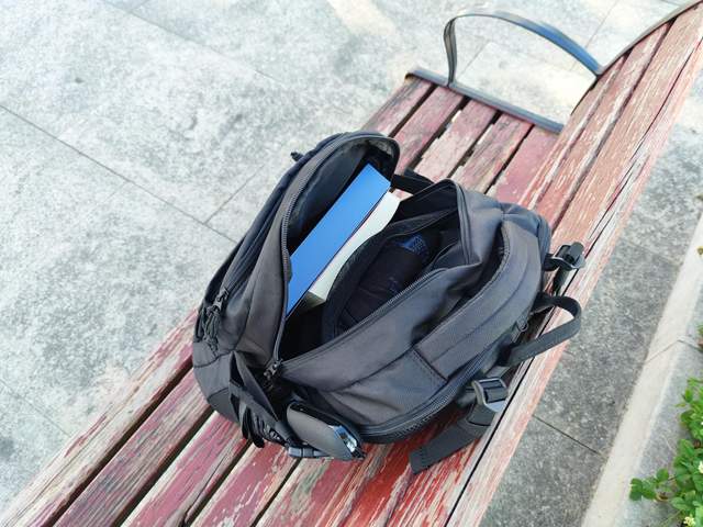 可以看到,悠启多功能双肩包有前幅多功能收纳仓、前置生活仓、后置工作仓三大分仓。多功能收纳仓我通常是放置充电宝、钥匙、移动硬盘、笔、记事本等小物品;出差或者旅行,就放置轻薄衣物、牙刷等小件生活用品,反正空间大,可灵活调整。