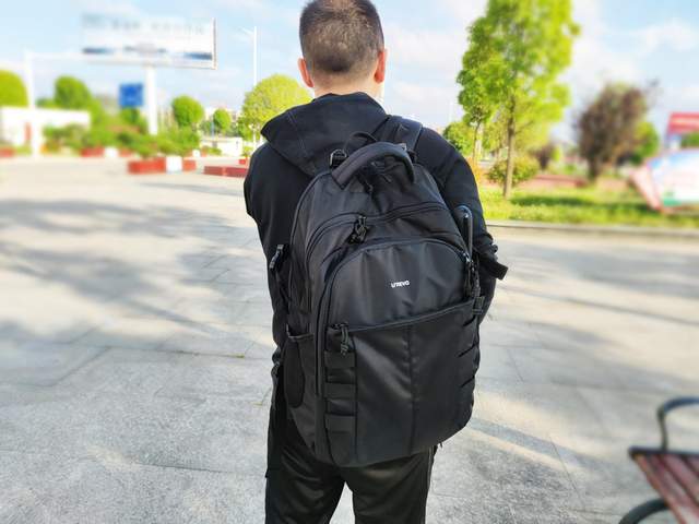 拿到悠启多功能双肩包的第一感觉就是低调,除了LOGO外全部是黑色,加上多处拼接设计,有种大隐于市的感觉。背包的三围是34×16.5×49.5cm,空包重量980g,大小还算适中;采用立体挺括线条设计,空包状态也能立体有型,工作服、休闲装都能够轻松搭配。