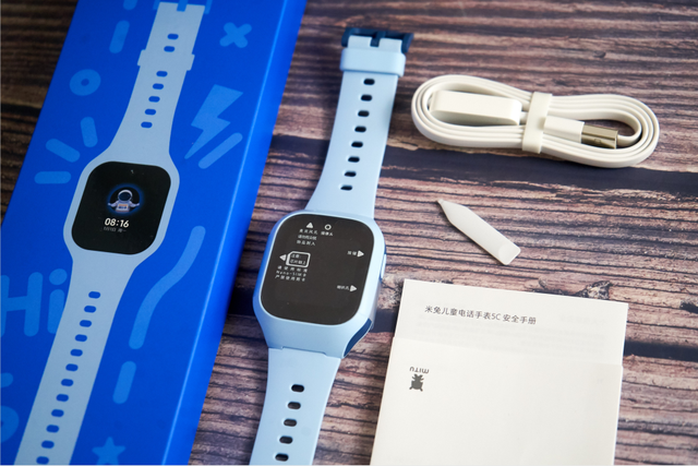 包装内有塑料盒固定的电话手表本体,一份详细的说明书,一条充电线,一个专用取卡针,手表屏幕上还有说明指出了每个按键和接口的作用,更贴心的是,手表屏幕出厂自带保护膜。米兔5C拥有1.4英寸方形屏幕,延续儿童手表一直以来的使用习惯。硅胶表带柔软亲肤,整体重量较轻,适合小妹纤细的手腕和活泼好动的本性。