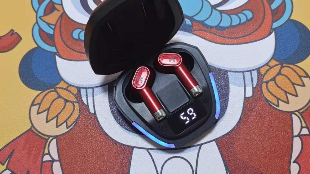 此款耳机共有黑色与红色两种,我买的是红色,充电盒设计酷炫风,搭配幻彩呼吸灯,开盖瞬间就会亮起来,共有三种颜色循环变化,这就是“游戏”的代名词。充电仓上面还有电量的显示,完全精准到具体电量,不再是几个点亮灯的设计,可以准确知道何时需要充电。
