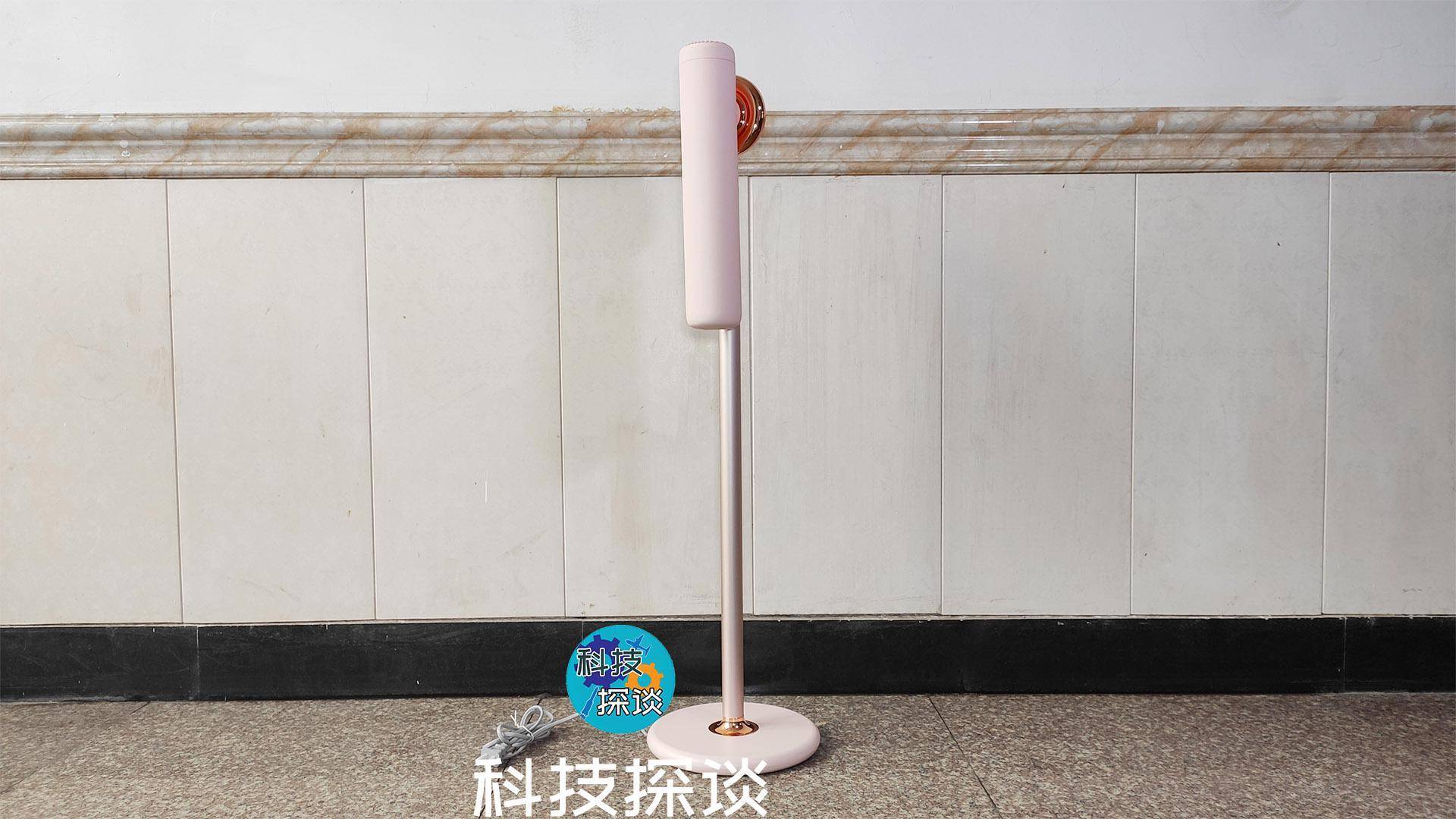 将伸缩杆装在底盘上后,电吹风机的模样与立式风扇结构相似,有小半人的高度。