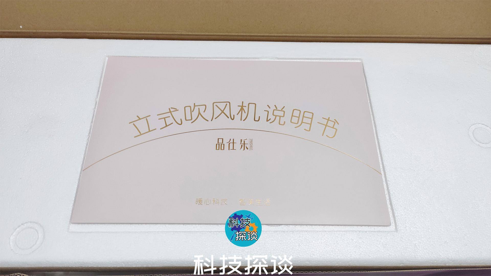 打开包装盒,首先进入眼帘的是用精致信封包裹的产品说明书,内附有感谢使用产品的贺卡和产品详细的使用说明书。拿开结实的泡沫,整个风扇的附件还有带电源线的风机底盘、遥控器和带伸缩杆的主机。