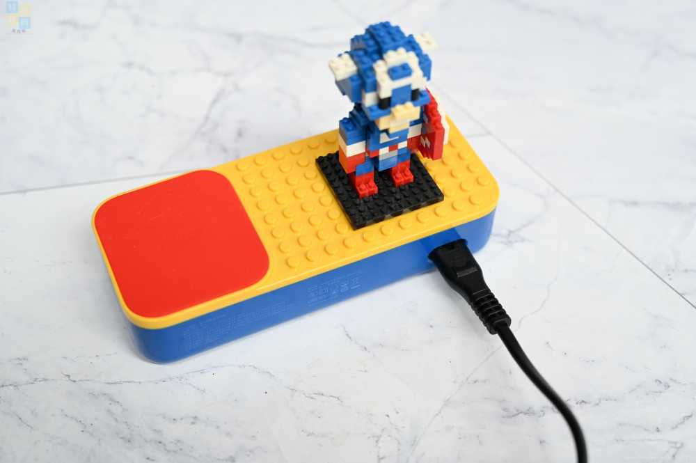 这款充电器在结构上不算复杂,它的顶部有一大块积木底座设计,并且采用了撞色设计,我的这款上面有红、蓝、黄三种色调,看起来比充电器常见的白色、黑色要更好看一些。另外在充电器的顶部还有一个无线充电区域,采用了硅胶材质蒙皮设计,不容易刮花手机,而且还具有很好的防滑效果。