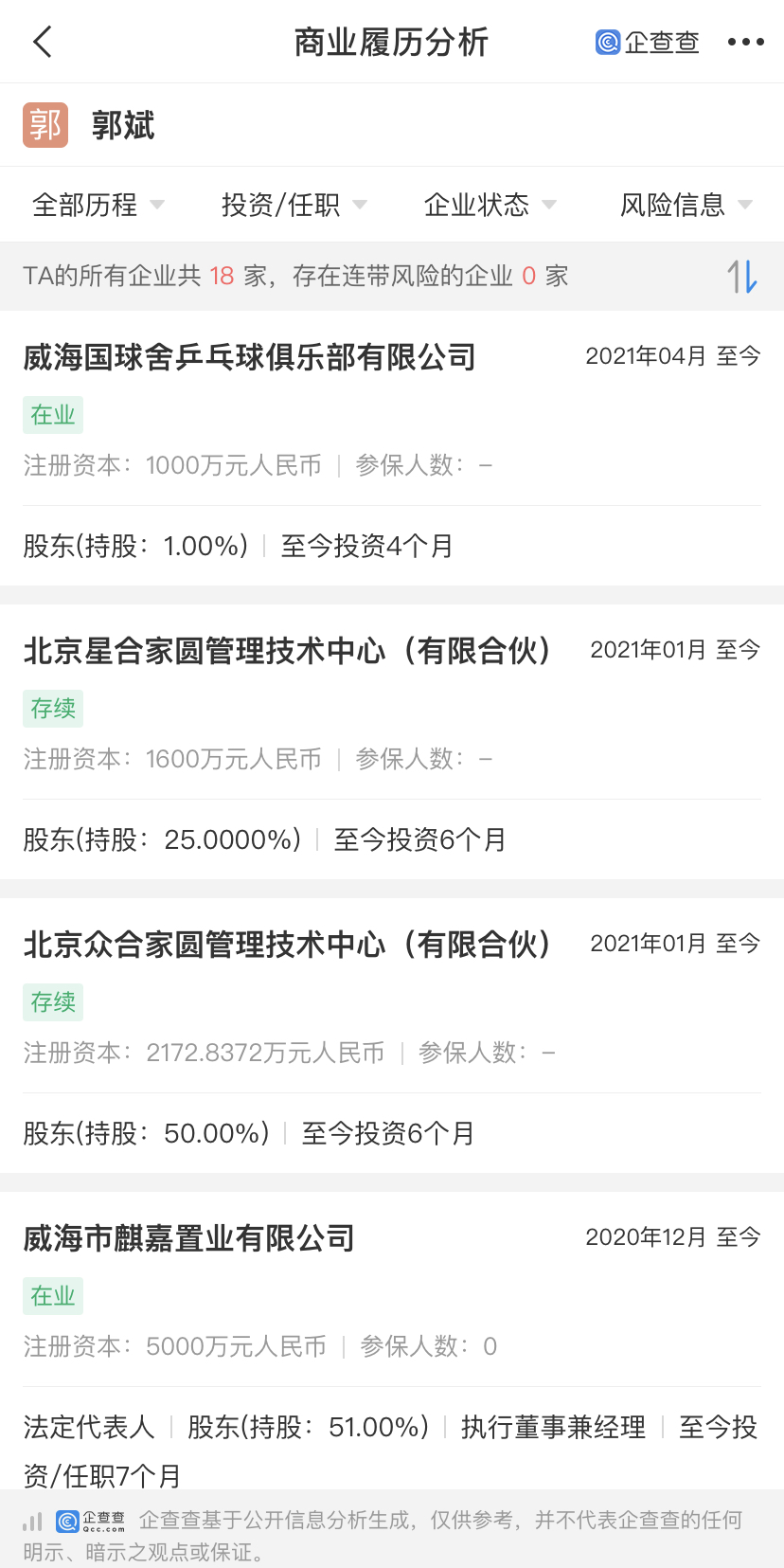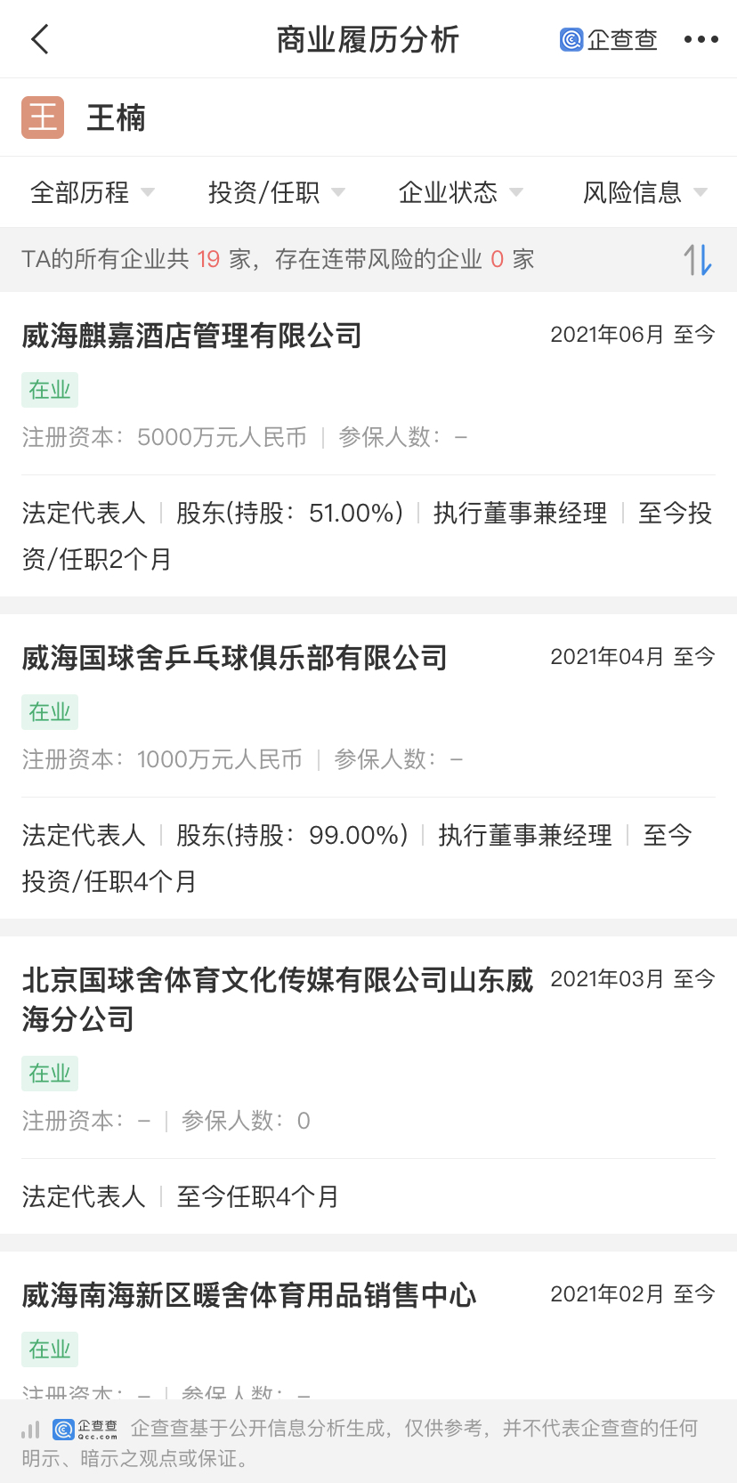 此外,赛场上驰骋的王楠,在商界也“如鱼得水”。企查查APP显示,王楠共关联19家企业,丈夫郭斌共关联16家企业,涉及体育、服装、酒店、教育、文化传媒等多个行业,包含北京国球舍体育文化传媒有限公司、亲见教育科技(威海)有限公司、威海南海乒乓球训练基地管理有限公司等。
