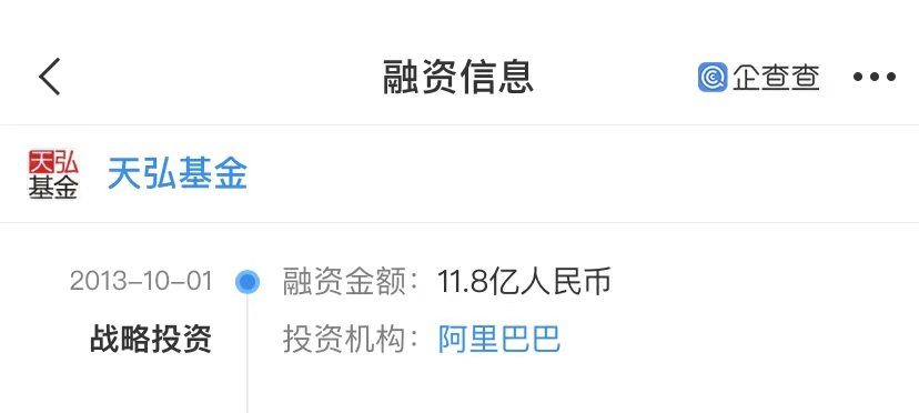 天弘基金成立于2004年11月8日,是经中国证监会批准设立的全国性公募基金管理公司之一,目前注册资本5.143亿元。企查查APP显示,2013年,天弘基金获得阿里巴巴战略投资。