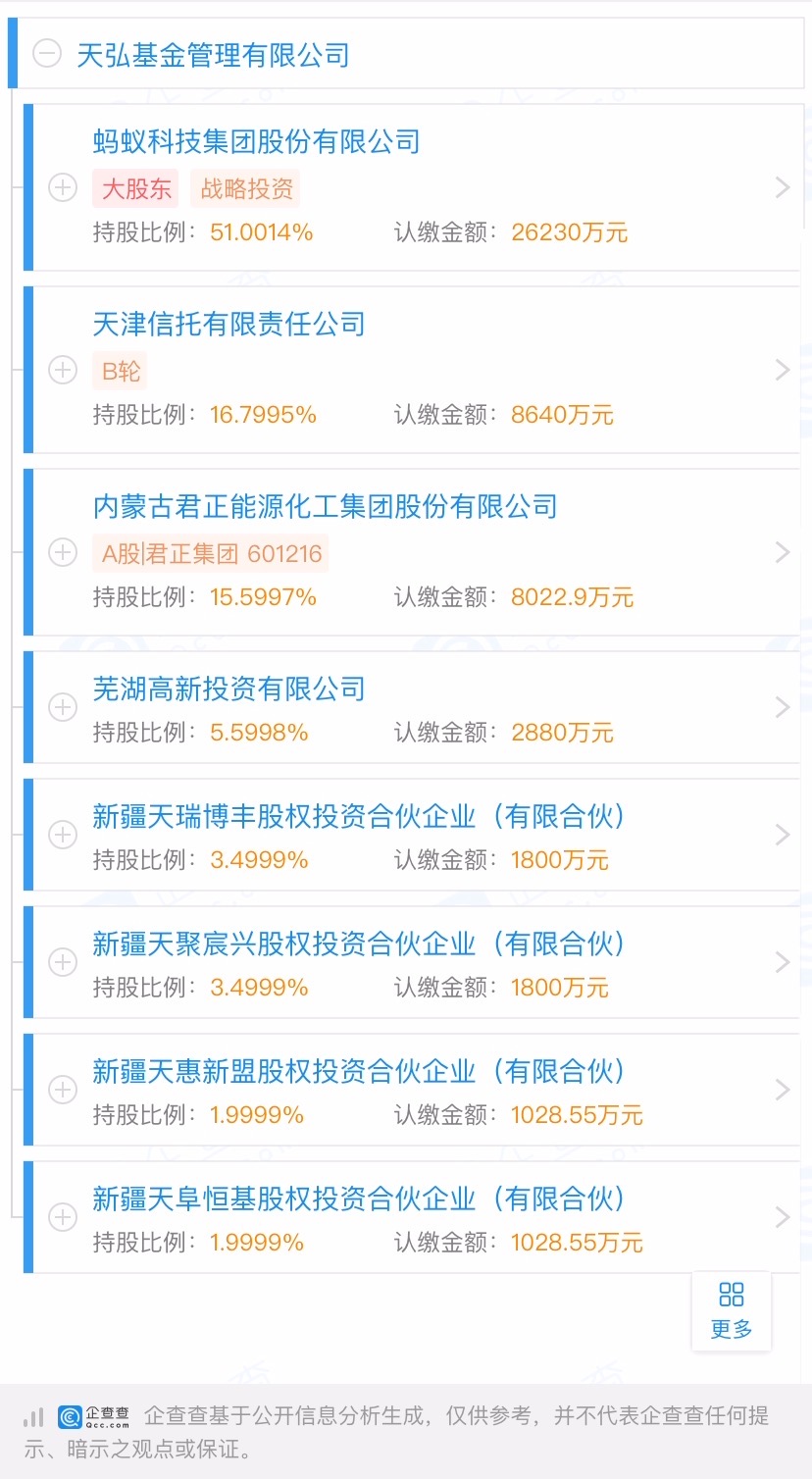 企查查股权穿透显示,天弘基金第一大股东为蚂蚁集团,持股51.0014%,天津信托有限责任公司、君正集团(601216)分别持股16.7995%、15.5997%,为第二、第三大股东。