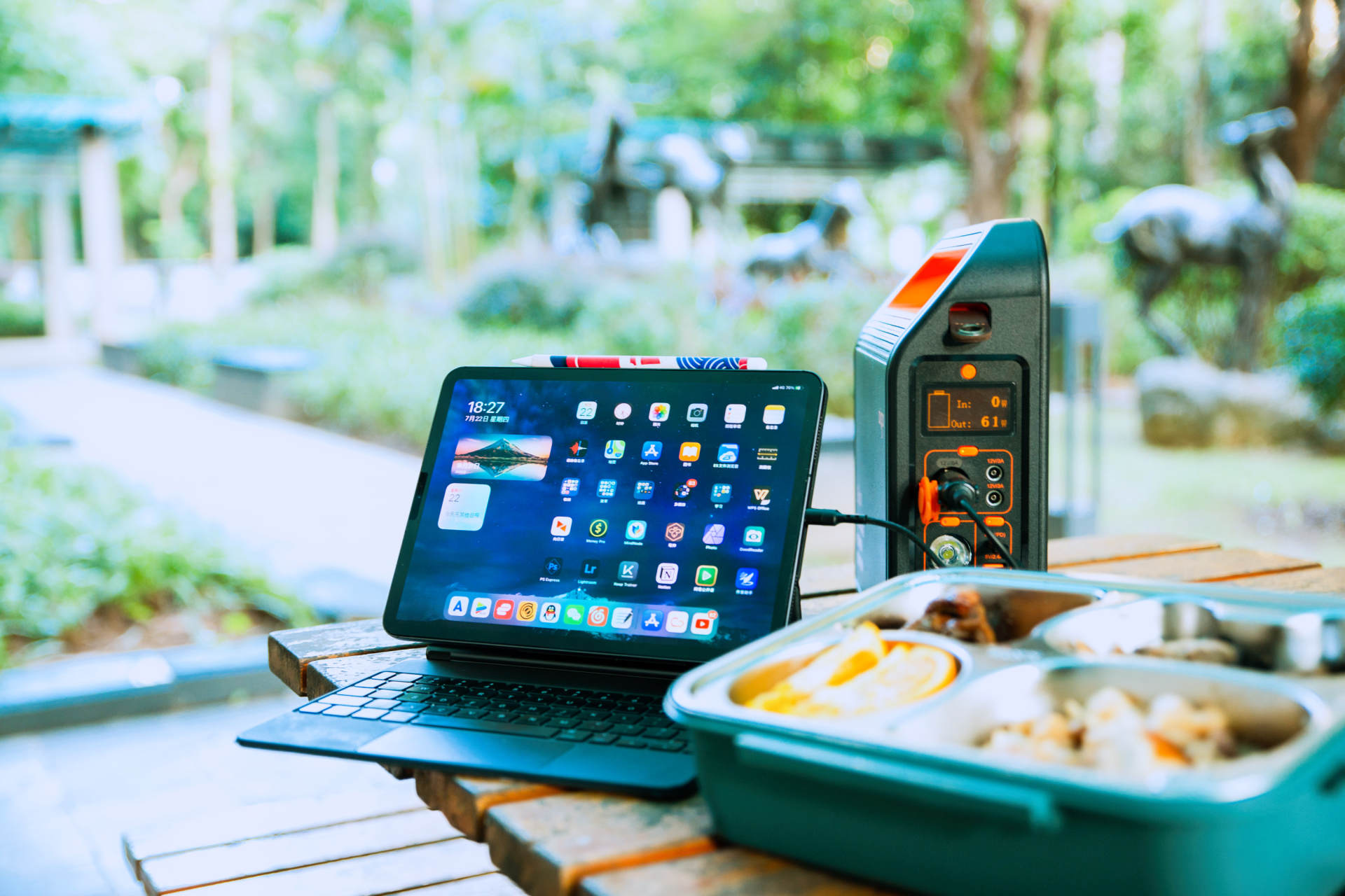 由于aigo国民好物S300户外移动电源能够稳定输出与市电同频的纯正弦波交流电,在功率的限制下你甚至可以利用开水,泡起自嗨锅,也可以像我一样,通过无水加热饭盒,让野餐也能有丰富热乎的饭菜!