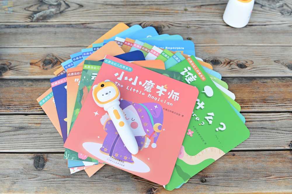 机器岛AI双点笔配套的这些启蒙教材中,有着丰富的人物和故事,并且还是双语内容,刚开始看的时候觉得上面的文字内容太少,后来才发现,教材里面的人物、边角都可以识别出丰富的语音内容,这还是孩子自己发现的,之后孩子还特别喜欢上面的各种找一找、数一数小游戏。