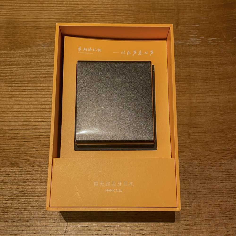 将橙色的内层盒子抽出后,就能看到耳机的充电仓了,虽然隔着一次性塑料纸,但仍能看得出南卡N2S充电仓的金属质感。
