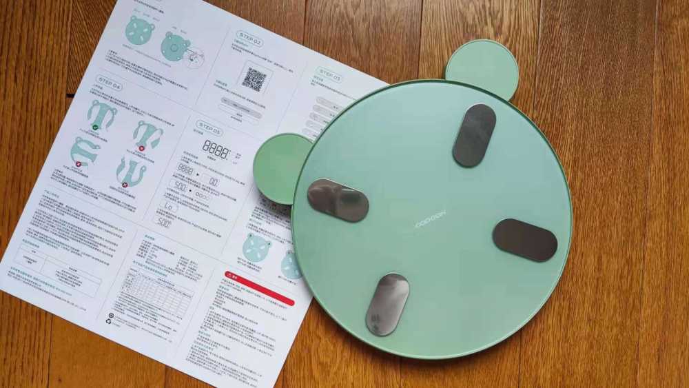 产品附带一张说明书,详细记录了使用方法。体脂秤尺寸为294*292*26.5mm,厚度仅仅为一枚1角硬币厚度,非常小巧。采用的圆弧性设计,较方形有更好的防撞效果。可以测量5-180kg重量,能满足绝大部分人的使用需求。蓝牙4.2版本能够快速与手机相连,没有延迟。