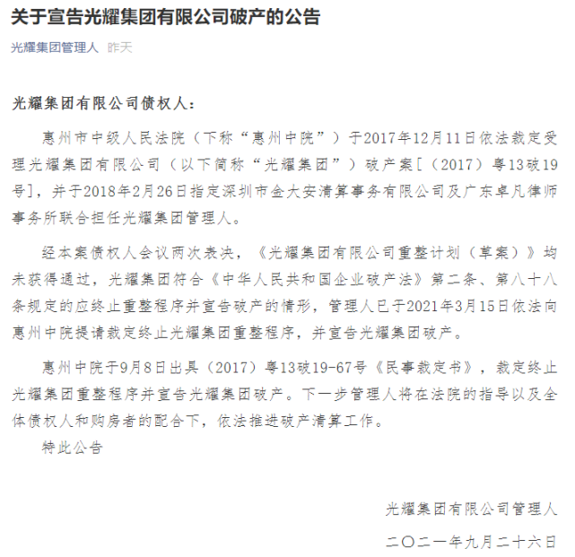 ,雷达财经出品 文|李亦辉 编|深海,昔日的百强房企光耀集团有限公司(下称“光耀集团”)挣扎四年后,未能逆天改命,最终走向了破产。,9月26日,光耀集团管理人公告了此消息,称“重整计划”未获债权人会议表决通过,广东惠州市中院裁定终止光耀集团重整程序并宣告破产,下一步将依法推进破产清算工作。,这家从惠州出发,布局长三角、环渤海区域的房企,在天津、山东都留下痕迹,一度还跻身全国房企百强。但超常规发展以及大量涉足民间借贷,让光耀集团在2014年陷入资金链危机,2017年向惠州中院申请破产重整。,“只要再给3至5亿,就能缓过来”,陷入困境后,光耀集团背后的创始人郭耀名曾公开求救,但之终没能等来他的“白衣骑士”。从进入重整程序到裁定破产,4年时间也没能挽救了光耀集团。,目前郭耀名远走他乡,被法院以160万元悬赏。,历时4年重组失败宣告破产,光耀集团的破产之旅,开始于四年前。,2018年1月,惠州市中级人民法院宣布,2017年12月11日正式接受光耀集团申请破产重组,集团破产案尚未解决。,同一时间,通过竞争选任管理人方式,深圳市金大安清算事务有限公司和广东卓凡律师事务所被指定共同担任光耀集团管理人。,启动破产重整程序后,招募到了四家意向投资人,分别是青岛城投资产管理有限公司、惠州市光明天地投资有限公司联合组成的投资人,另三家分别是杭州顺润贸易有限公司、华润资产管理有限公司、上海东兴投资控股发展有限公司。,对经营陷入困难的企业,重整成功可摆脱债务危机,获得重生机会,债务人和债权人都能获得较好收益,同时能解决工程方、业主、金融机构等众多相关方的问题。,根据当时公告,截至2016年6月末,光耀集团资产清查总额约为64亿元,负债清查总额约为79.7亿元,加上为关联公司提供担保产生的负债约26.2亿元,以上债务共计约105.94亿元。,也就是说,这个时候光耀集团已资不抵债,差额在42亿元的水平。,据时代财经报道,到了2018年5月据第一次债权人会议时,共有1172家债权人向其申报债权,购房者人数占比高达75%,申报债权总额达212.78亿元。,管理人经过审计,截至2017年12月31日,光耀集团账面资产总额为39.95亿元,负债总额为68亿元,资不抵债金额为28亿元,账面资产负债率为170.23%。,截至2018年4月28日,在光耀集团开立的九个银行帐户中,总余额仅9863.08元。另外,39.95亿元的账面资产中,近13亿为长期股权投资的账面价值,近16.3亿为与关联公司的应收款。,“光耀集团未来实际可变现的资产价值预计将远小于账面资产价值。”管理人称,这种资不抵债的情况下,要想重整成功并非易事。,后续第二、三次债权人会议《公司重整计划(草案)》表决未获通过,公司因明显缺乏清偿能力,被惠州中院依法裁定破产。,