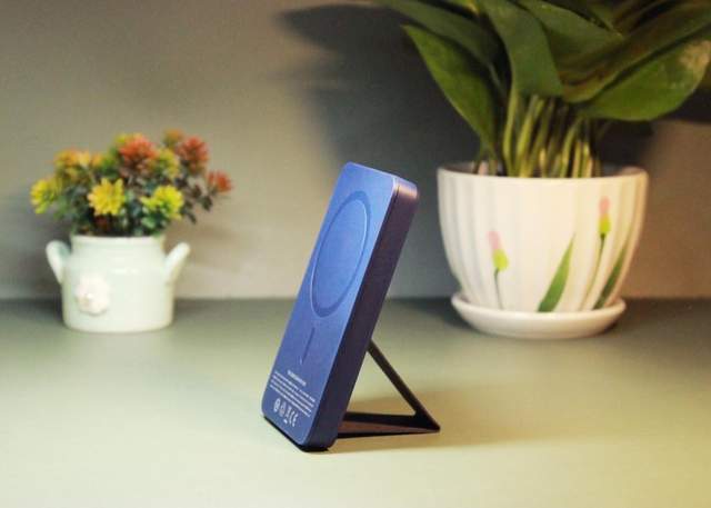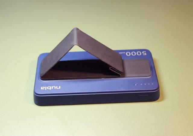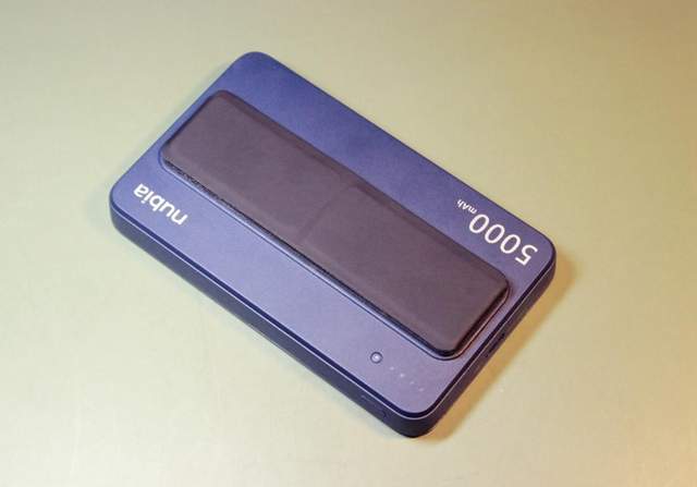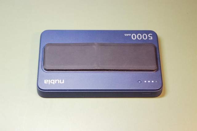 努比亚磁吸无线充移动电源正面上方的大圆形区域是它的无线充电面板,它下方的小椭圆区域就是它的磁吸面板区域,内置环形磁铁组,能够很好的吸附在具有磁吸无线充功能的手机上面,电源背面则有一个非常显眼的黑色折叠支架。