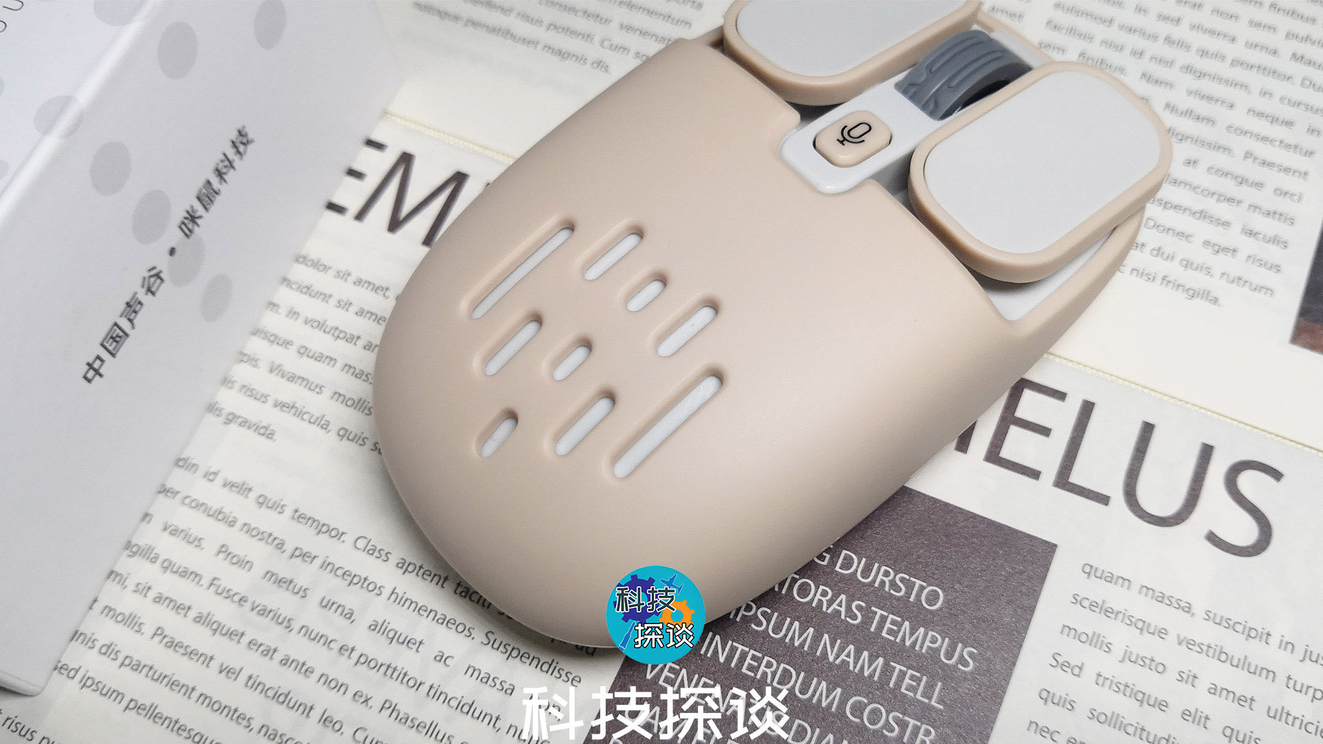 咪鼠智能语音鼠标S5B作为S5的升级款,它的外观目前只有星空灰和浅米杏,外观涂装上上比S5要少一些,外观的设计还是与S5保持一致,既复古有潮流,正面看上去鼠标像一只小蜜蜂,包边的鼠标左右按键像眼睛,语音键像口器,灰色的鼠标中键上还有奇特的纹理,对称分布的九条镂空透气条纹在鼠标顶端侧旁,可以让手长期持握鼠标不留手汗。