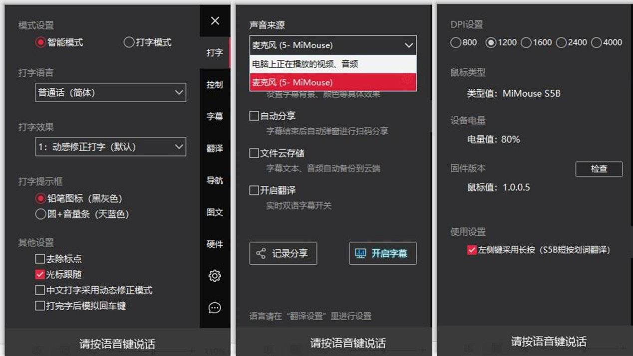 除了这几项功能外,在“咪鼠”软件里还有不少有趣的功能,比如调节DPI,可调节的范围就有800、1200、1600、2400和4000这几个;除了识别说话声,还能够识别电脑上播放的音频、视频内的语音,将文字提取出来。
