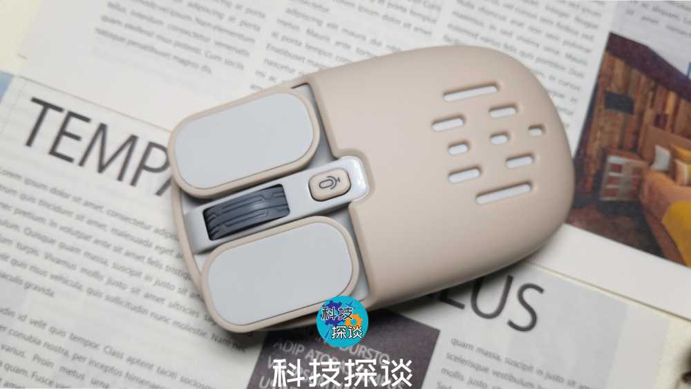 鼠标并非静音式鼠标,整体重量约100克,鼠标左右按键和中键的位置排布与同类产品相同,额外多出的语音功能按键在手指触按时不会显得膈应。Type-C充电接口位于靠近鼠标左右按键一侧面的中部,底部有四个白色的圆形底垫,鼠标开关、光学模块,蓝牙和2.4GHz切换键在鼠标背部中央横向一字排开,在底侧还有便于收纳2.4GHz接收器的收纳仓。
