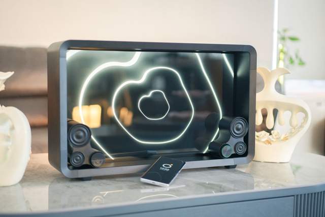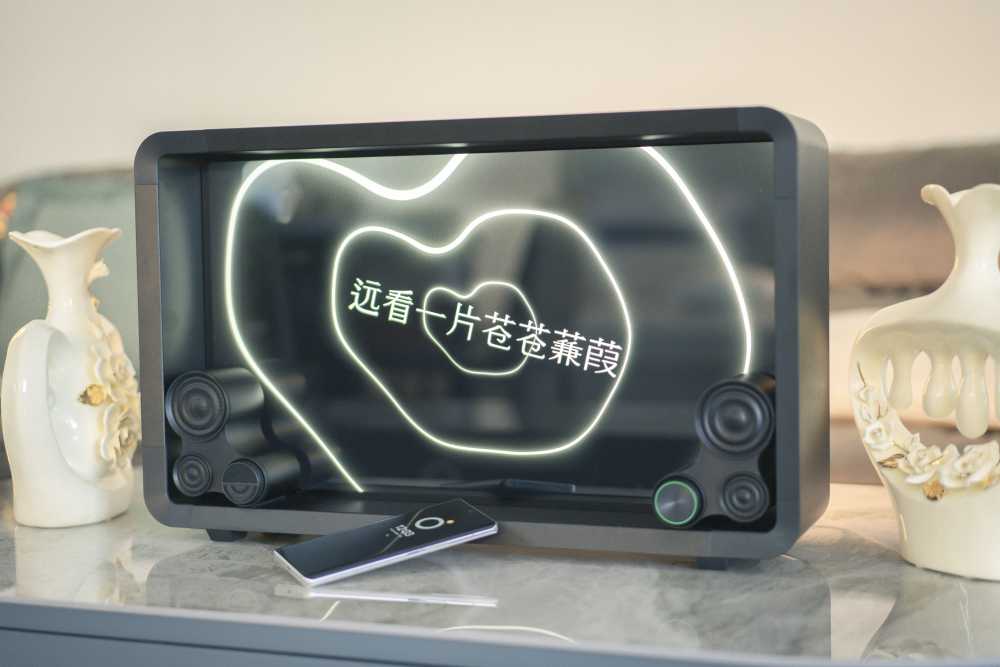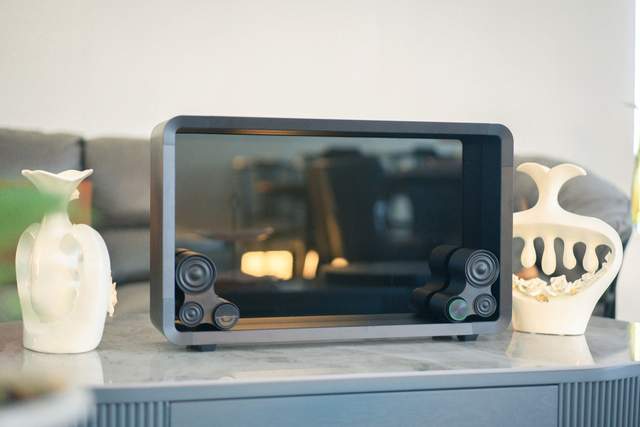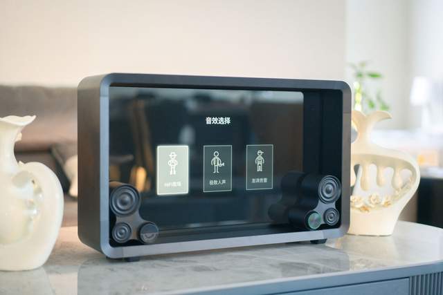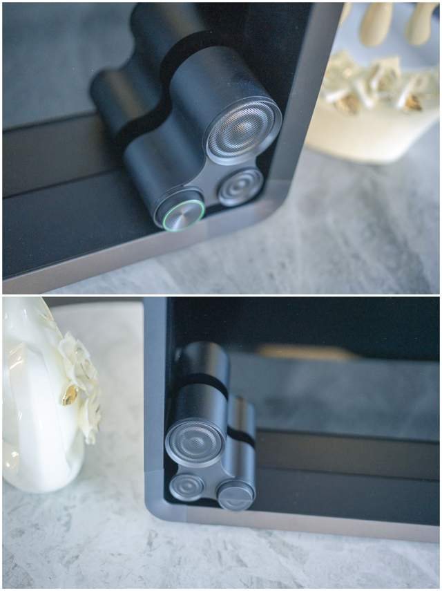 将音箱取出,透明的玻璃面板,加上正面两侧可按压铜色旋钮,加上整体黑色全金属无缝边框机身,去掉繁琐,给予极简设计风格的同时也带来一种一种对称美与科技感。正面一大块看似玻璃面板,还能反射出对面的物品,难道只是一块大玻璃那么简单?淘淘在这先设个谜,后面来解答!