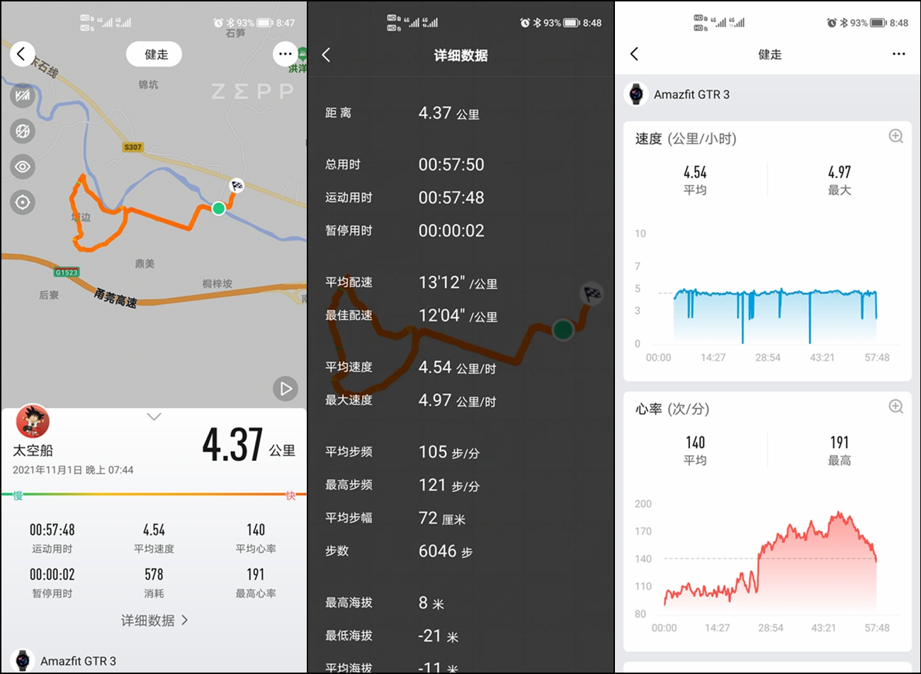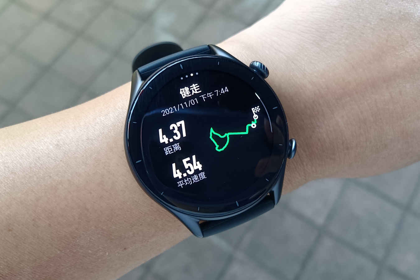 我选择了健走模式进行测试,在运动过程中,GTR 3会实时监测运动用时、距离、心率和速度,每当运动达到一定程度的时候,手表也会震动提醒,提醒用户有多少运动量了。此外,我还设置了最高心率提醒,当监测到心率过高的时候,手表同样也会震动提醒,避免心率过高带来的风险。