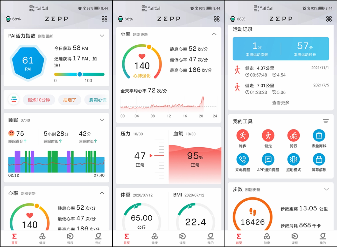 下载官方手机客户端Zepp APP就可以更好地管理GTR 3和查看各种监测数据了。初次运行需要注册一个账号登录,然后进行设备绑定操作,这个步骤有向导式引导,所以比较简单。APP的界面设计得简洁有序,默认的主界面显示的是各种监测数据,包括PAI活力指数、睡眠、心率、压力、血氧、步数等等。采用图表和文字相结合的形式呈现,配色清新美观,数据一目了然。