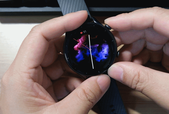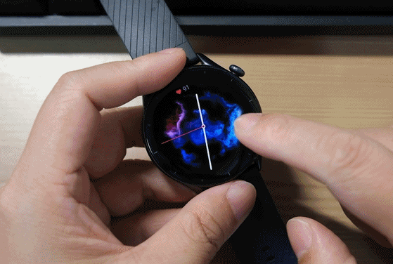 通过下面几张GIF动图,可以更加直观地感受Zepp OS操作系统的流畅度。首先是表盘图案的更换,按住主屏即可进入表盘图案浏览界面,还可以通过手机APP选择更多不同风格的表盘图案,甚至是自定义背景。