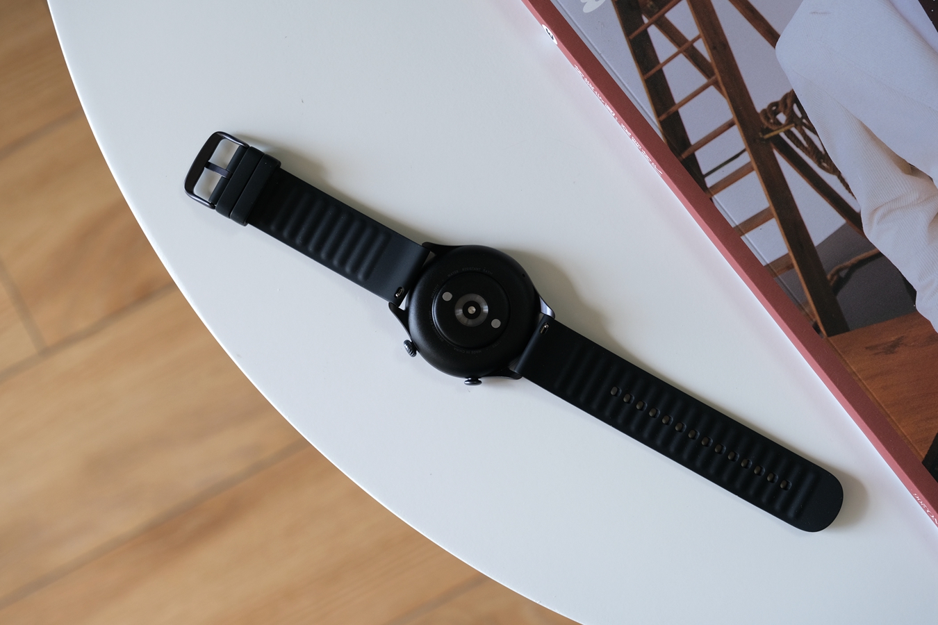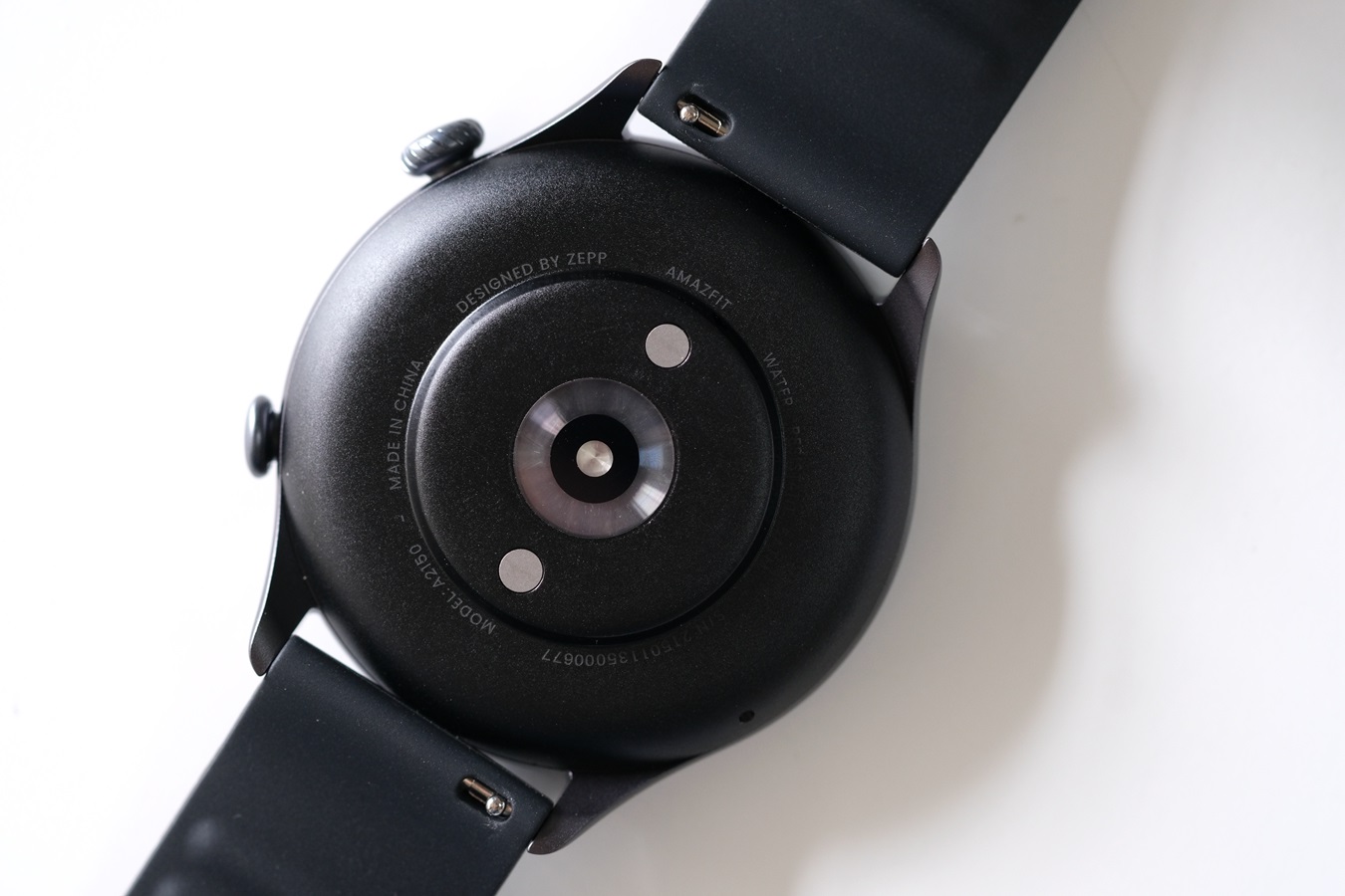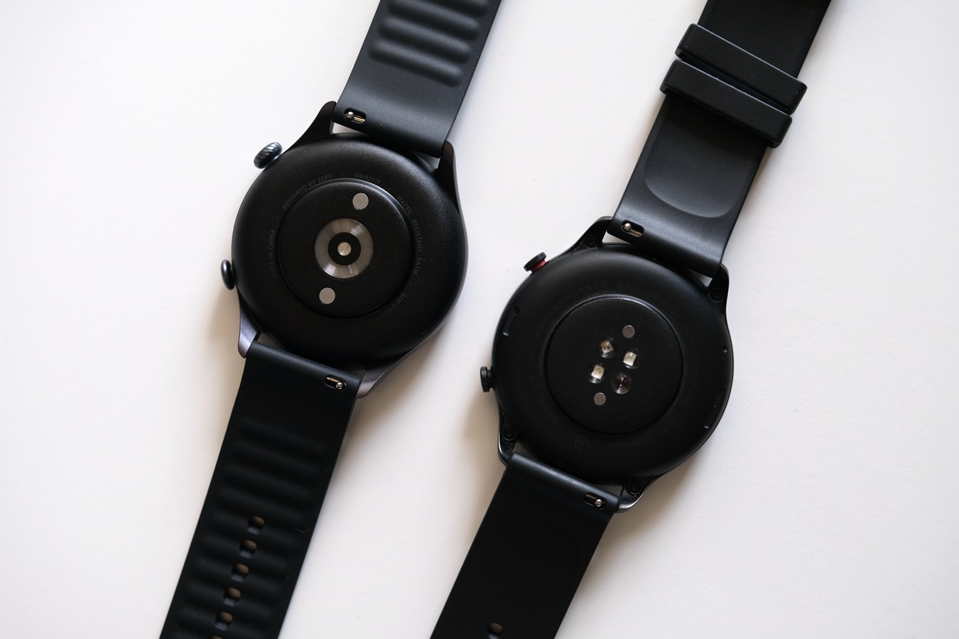 表盘的底面可以明显看出两者搭载的PPG生物追踪光学传感器不一样了,因为GTR 3的传感器升级到了最新的BioTracker™ 3.0,各种健康数据的检测速度大幅提升。此外,GTR 3的金属充电极片也比GTR 2大了些。