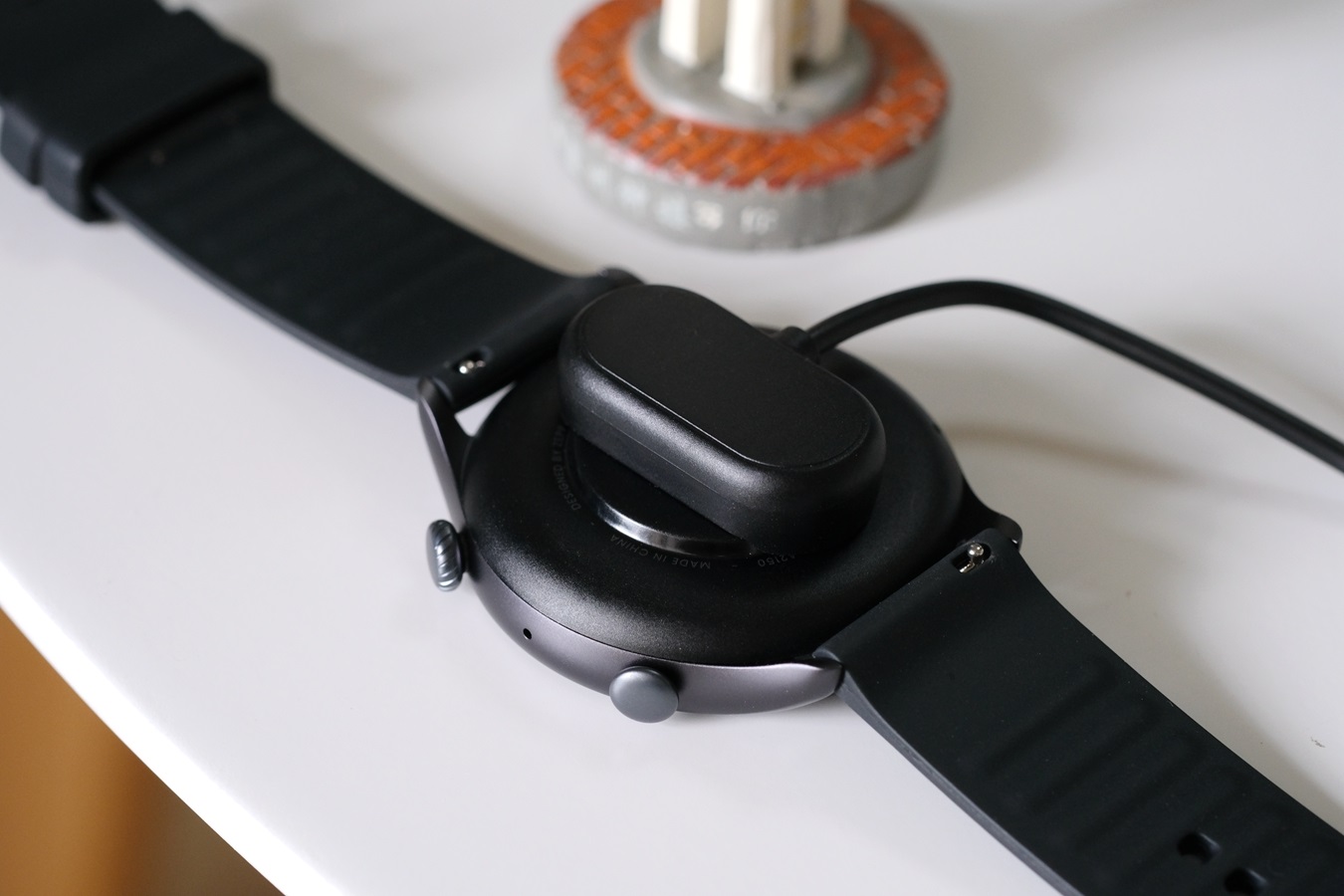 GTR 3的充电线接头采用了磁吸式设计,当靠近手表底壳时会自动与手表吸附在一起并开始自动充电。不过因为传感器尺寸变了,所以GTR 3与GTR 2的充电线并不通用。GTR 3内置了450mAh锂电池,只要2小时不到的时间就可以让电量满血复活,并带来日常使用模式21天、基础手表模式35天的使用时间,续航表现较为出色。