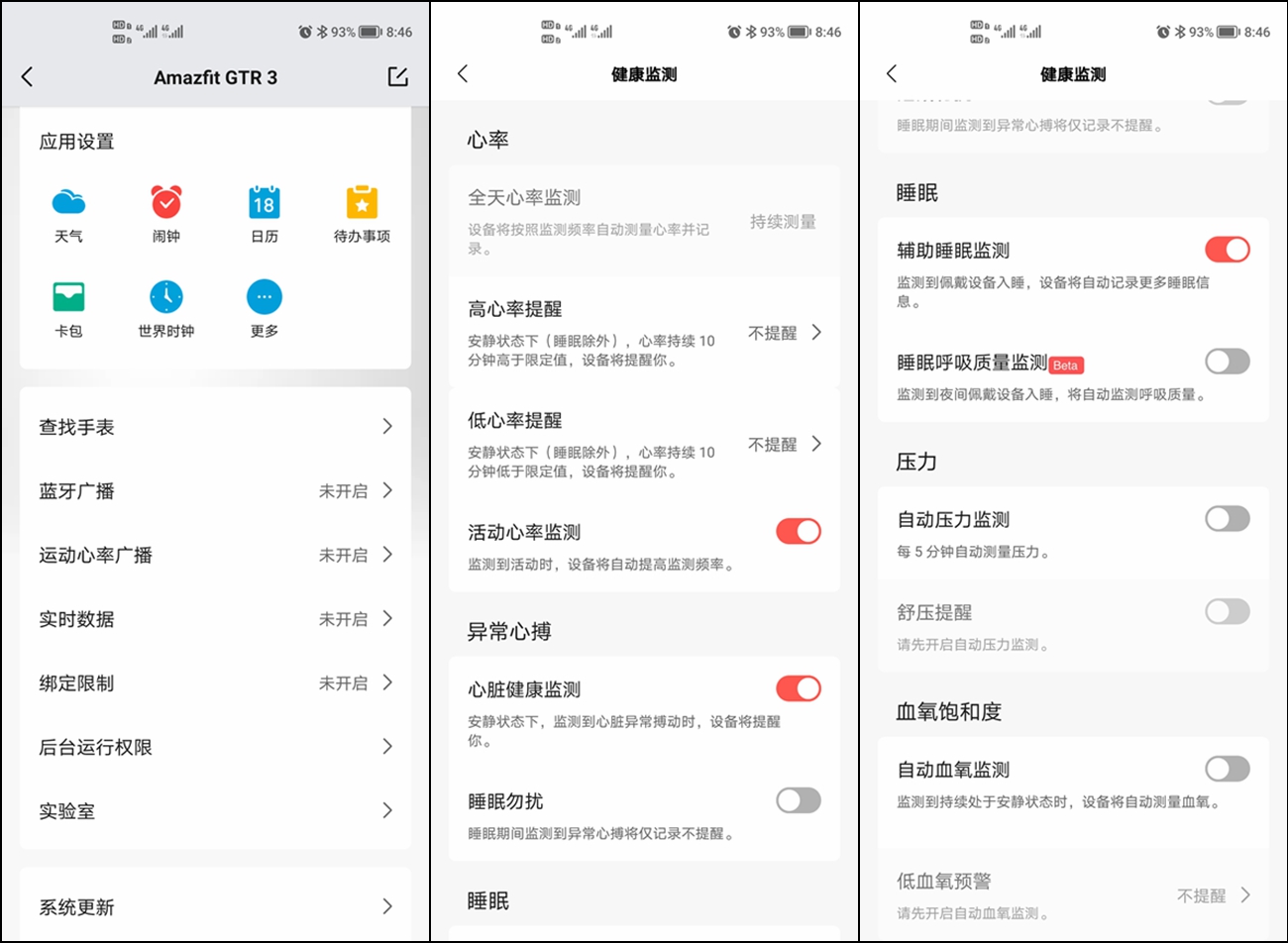 GTR 3首次搭载了Zepp OS操作系统,界面设计得十分美观,菜单也井然有序,在部分表盘、应用列表、应用运行界面里增加了动效,其中有的界面下支持最高60FPS的动画效果,除了带来更加出色的视觉享受,而且交互性也更强。Zepp OS操作系统运行起来也非常的流畅、稳定,我佩戴GTR 3也差不多半个月了,没有遇到操控卡顿、应用闪退、系统死机等问题。