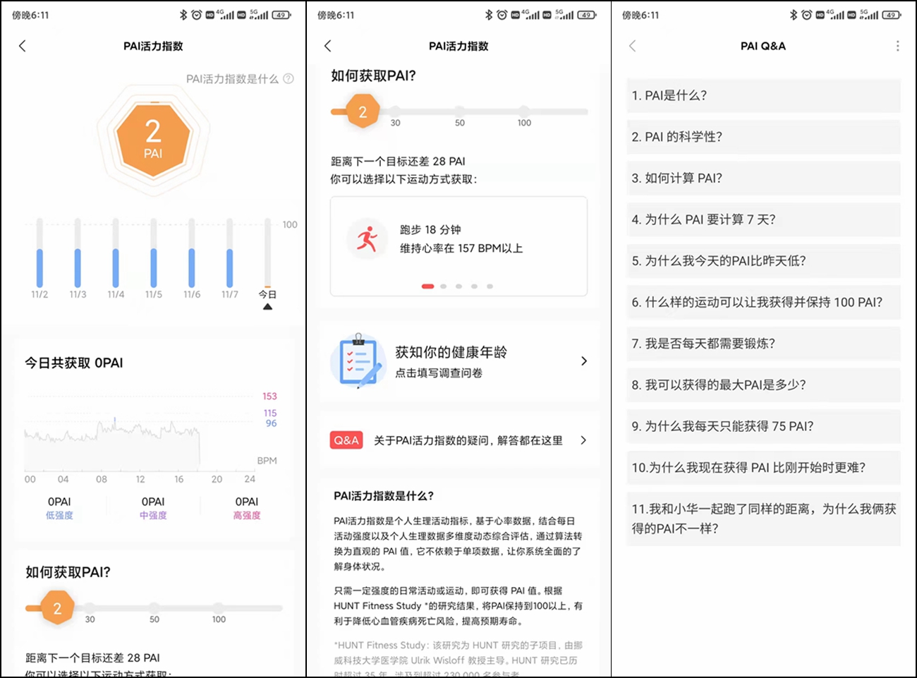PAI健康评估系统基于心率数据,结合每日活动强度以及个人生理数据多维度动态综合评估,得出个人生理活动指标PAI活力指数。PAI健康评估系统不基于单项运动数据,不限时间地点和运动形式,是针对不同用户的健康数据打造的个性化健康评估系统。简单地说,不管是做运动、还是做家务,所有能够带来心率变化的活动都有可能增加PAI活力指数。PAI代表的是最近7天的身体健康状态,只要这个数值保持在 100 左右,那么就意味着过去7天心肺功能已经得到有效的锻炼,如果一段时间没锻炼了,PAI活力指数就会开始下降了。