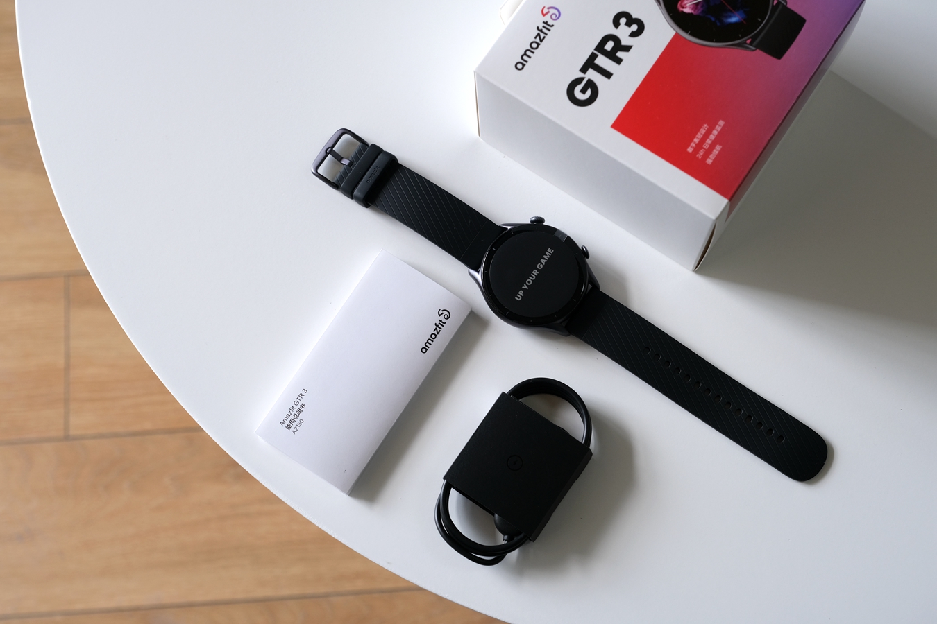 打开包装盒,映入眼帘的是GTR 3手表,它的配件包括了内含保修卡的产品说明书和专用的磁吸式充电线,厂家提供一年的质保服务。