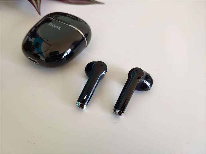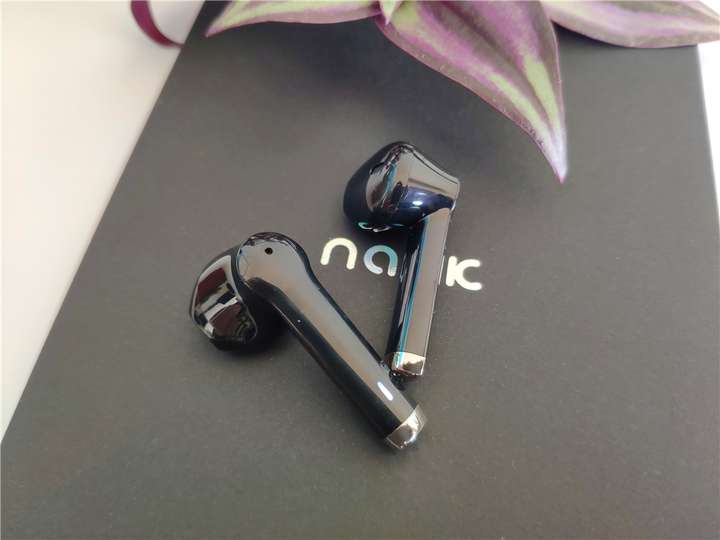首先开箱,极简黑的外包装,有一丝神秘气息,正面只有南卡的烫金logo,包装背部详细介绍了耳机的亮点:蓝牙5.2、AAC-APTX、13mm大动圈、以及ENC双麦降噪和双主机闪连等亮点。