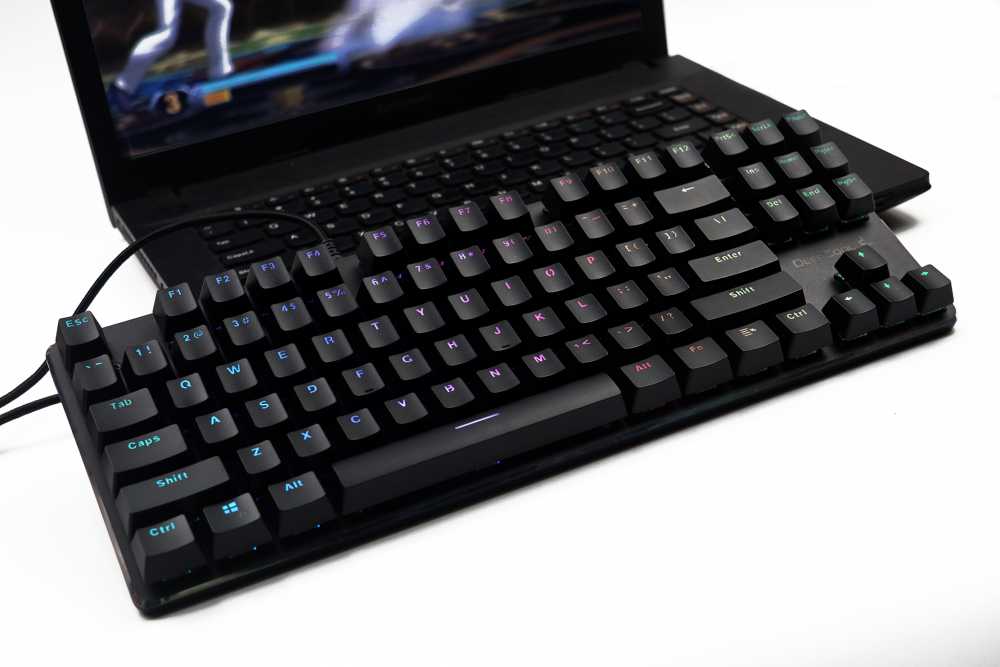 【产品及细节】 九州风神KB500机械游戏键盘采用常见的87键紧凑布局设计,纯黑色外观搭配悬浮键帽传递简约中带有电竞感,不管是游戏使用或者日常办公都很合适。
