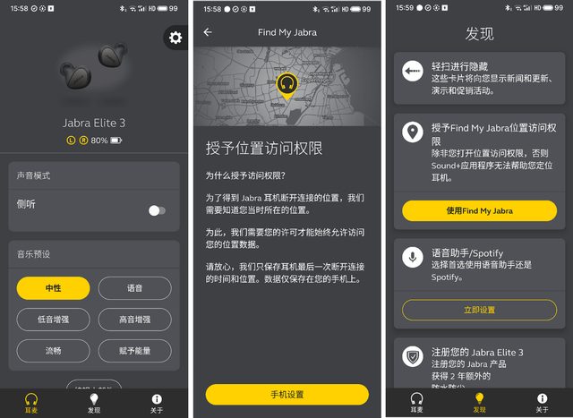而与APP配对成功之后,耳机的基本信息也会在APP上显示出来,各项参数也是基本能调整的,不过我要重点说一下 “Find My Jabra”这个功能,这个功能顾名思义,是放丢失的,通过APP,你可以清楚的知道现在你的耳机位置在什么地方,如果你是容易弄丢东西的人,这个功能对你来说应该有大用。