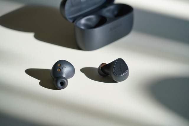 Jabra Elite 3外观方面也继承了Jabra一贯得风格,耳机采用无柄设计,三角形向下,四边棱角分明,到手的是深岩灰,颜色与外形都充满了赛博朋克的气息,表面logo位置是一个控制按钮,这款耳机并没有采用当下主流的触摸控制,不过按钮也不错,能够很好的避免误触,且采用了轻阻尼按键,点击时会有恰到好处的反馈感,又不会有太强的挤压感。