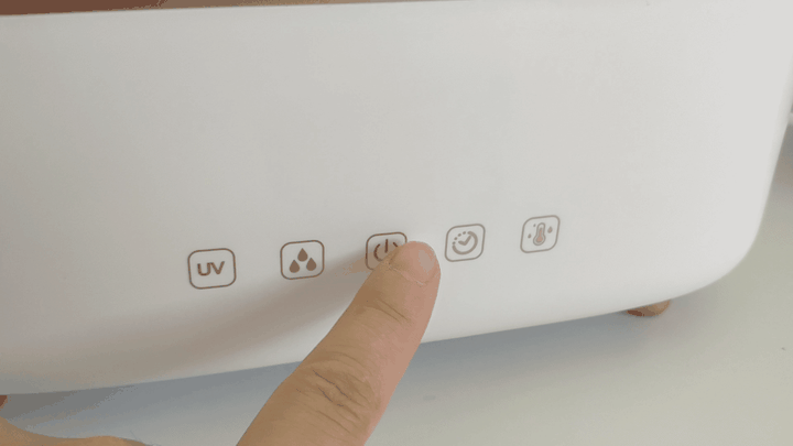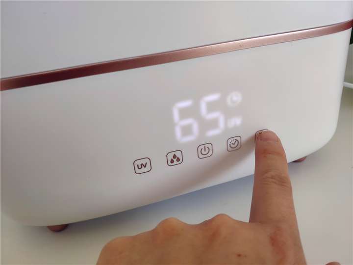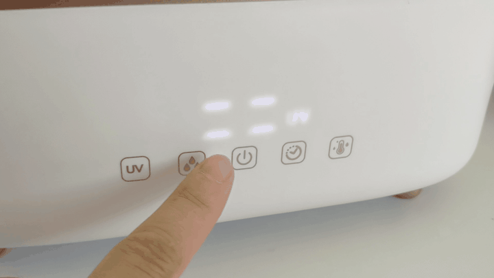从左往右触摸按键分别为:UV键、档位键、开关键、定时键和恒湿键、在按键上方有一块显示屏,可以显示当前的湿度,功能状态等 。首次开机默认三档出雾,有自动记忆功能,下次开机自动恢复关机前所设置的工作状态。
