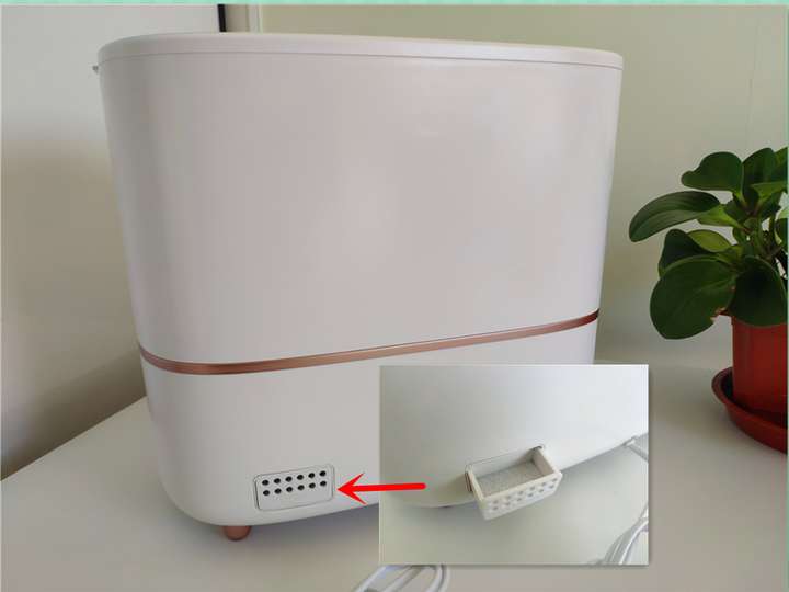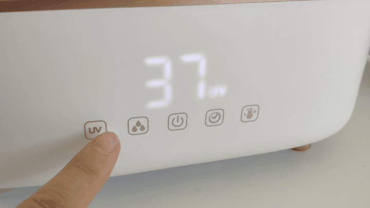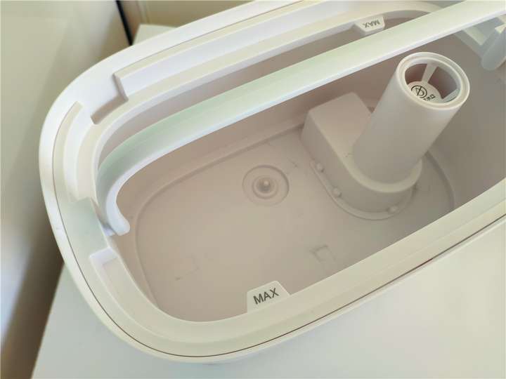 机体上的UV杀菌灯,这个加湿器除了滤芯的纳米灭菌,还支持UV-C除菌,双重净化,加湿除菌同时进行,用户可以放心使用。