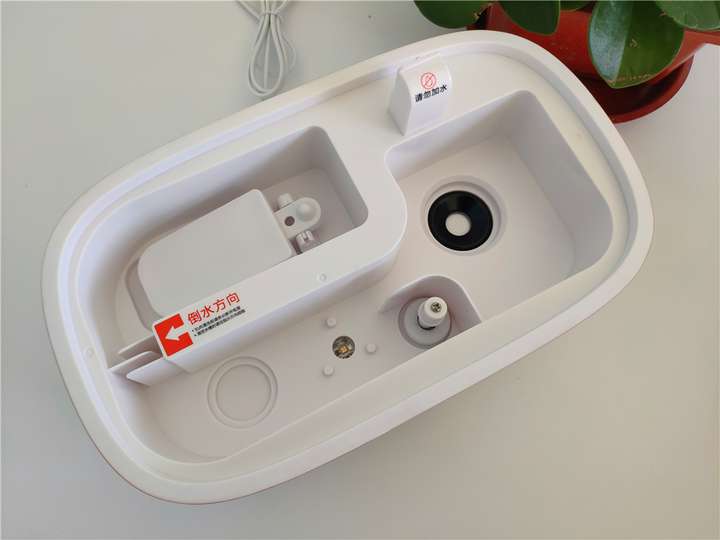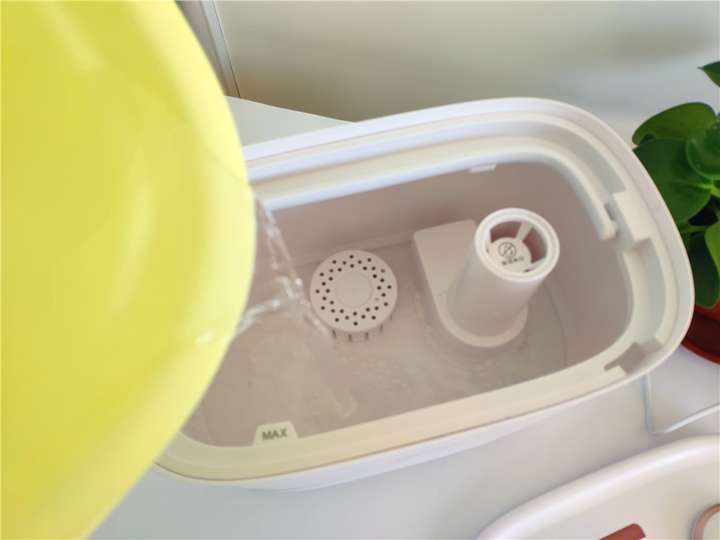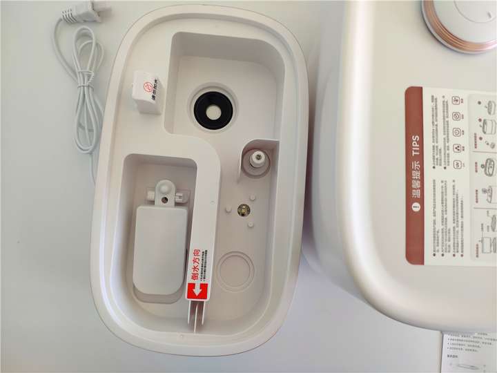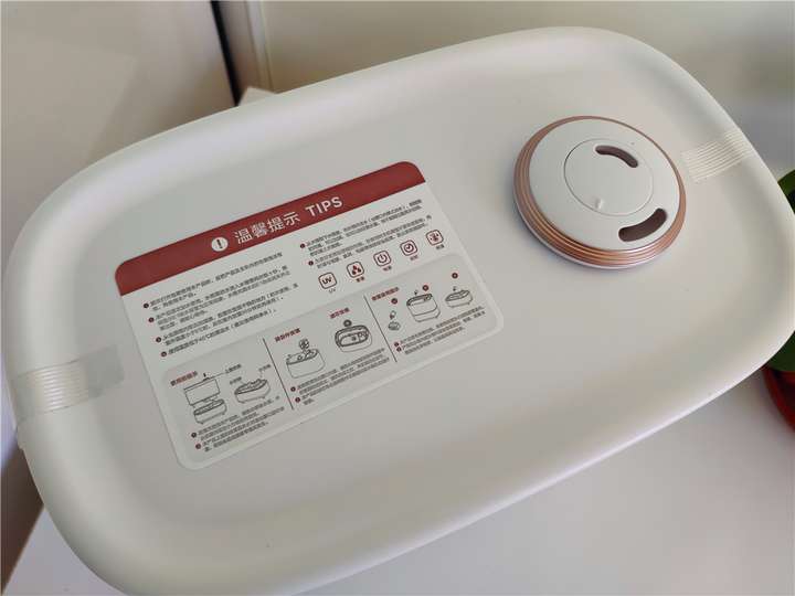 在水箱盖贴有一个提示标签,第一次使用的用户,可以根据提示操作,水箱盖右侧是喷雾盖,不可拆卸设计,喷雾盖设计为可360°调整的双喷雾口,出雾加湿更均匀,也满足不同使用场景的出雾要求。