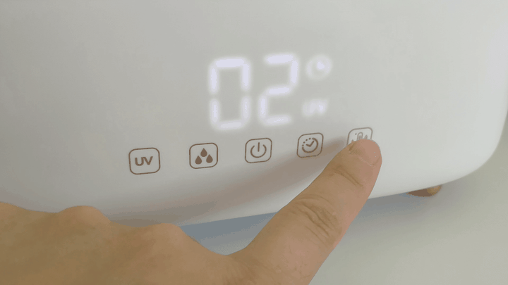 接通电源,听到“滴”一声后,按一下开关键,加湿器开始工作,显示屏显示当前湿度。按一下UV键,开启/关闭UV除菌功能,屏幕亮起UV图标,缺水、停止加湿器雾化或关机即同步关闭UV灯,除菌功停止。再按一下UV键,U山杀菌功能关闭,屏幕上UV图标熄灭。