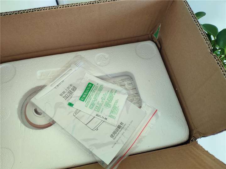 打开包装箱首先看到的是说明书配件,加湿器用泡沫固定,避免运输中有晃动,划伤产品。