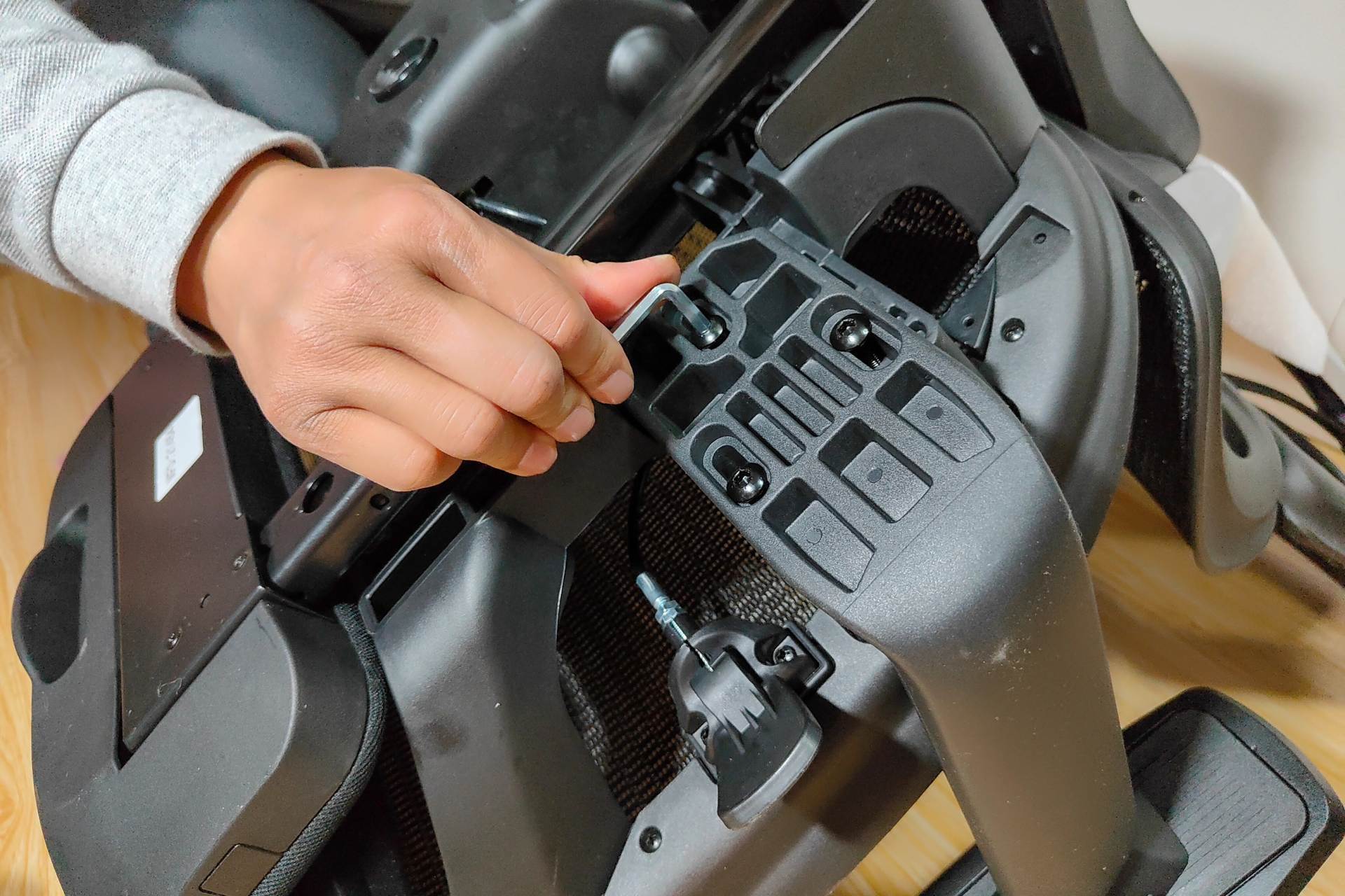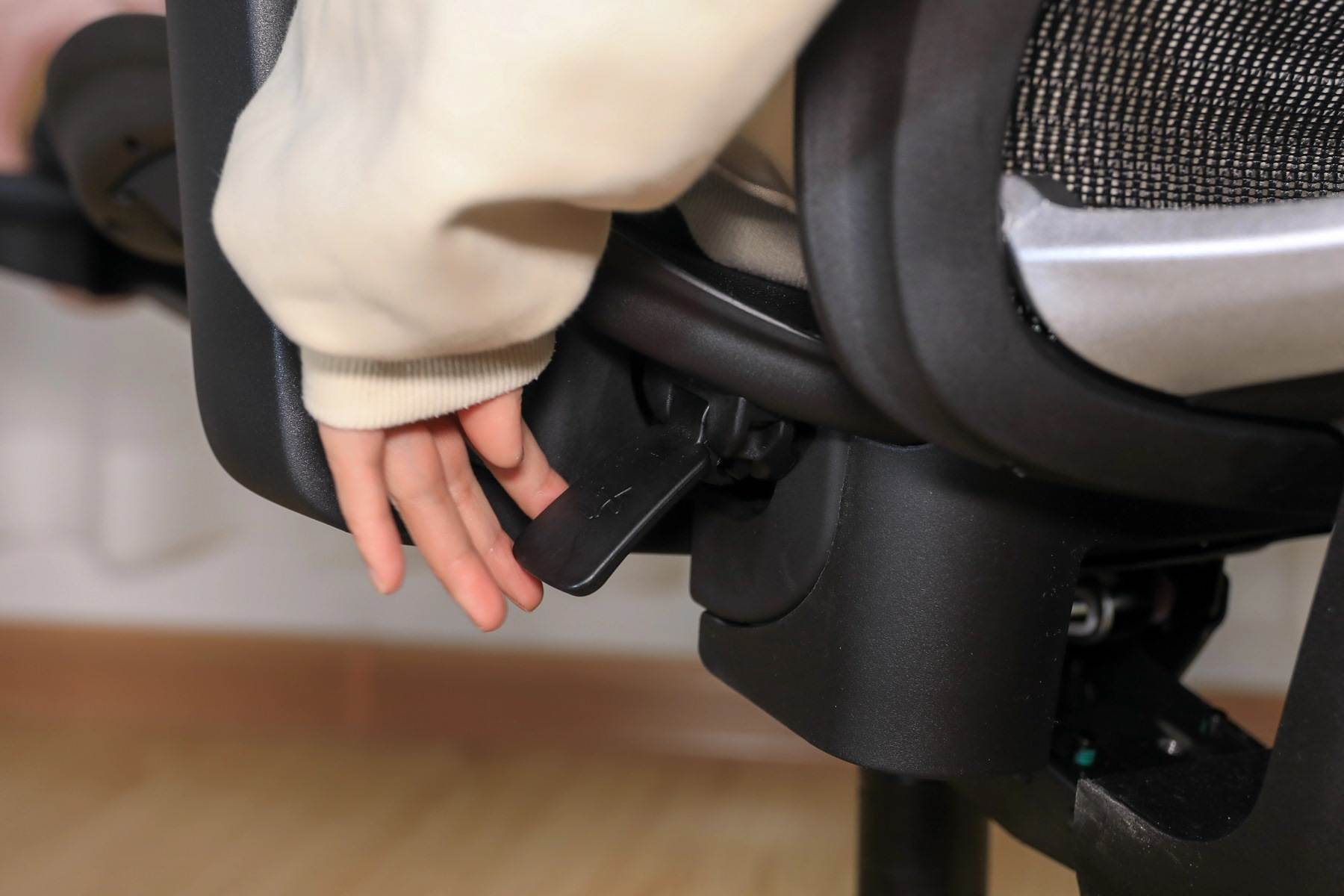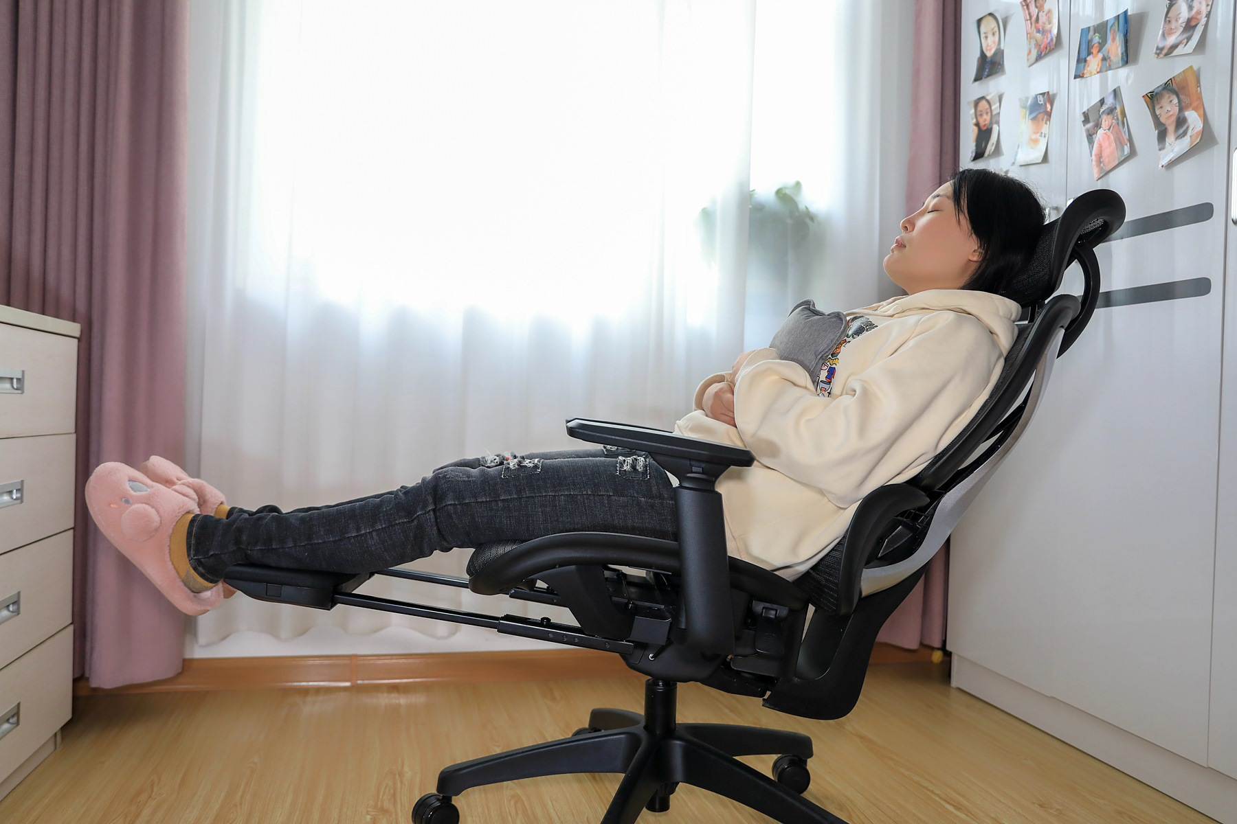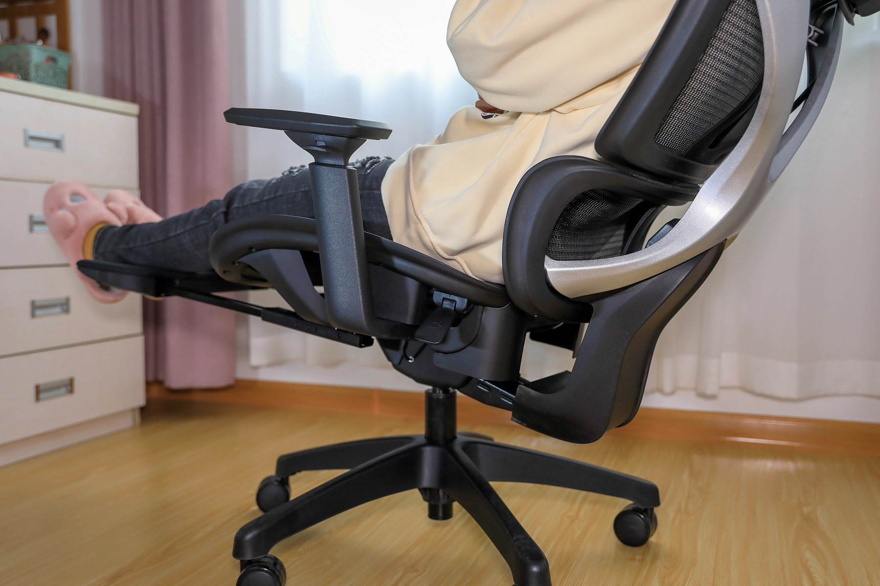 工作累的时候,还可以把靠背调整到135度的躺睡角度,把座垫下面隐藏的脚托拉出来,小腿安放于此,开启小憩时间。