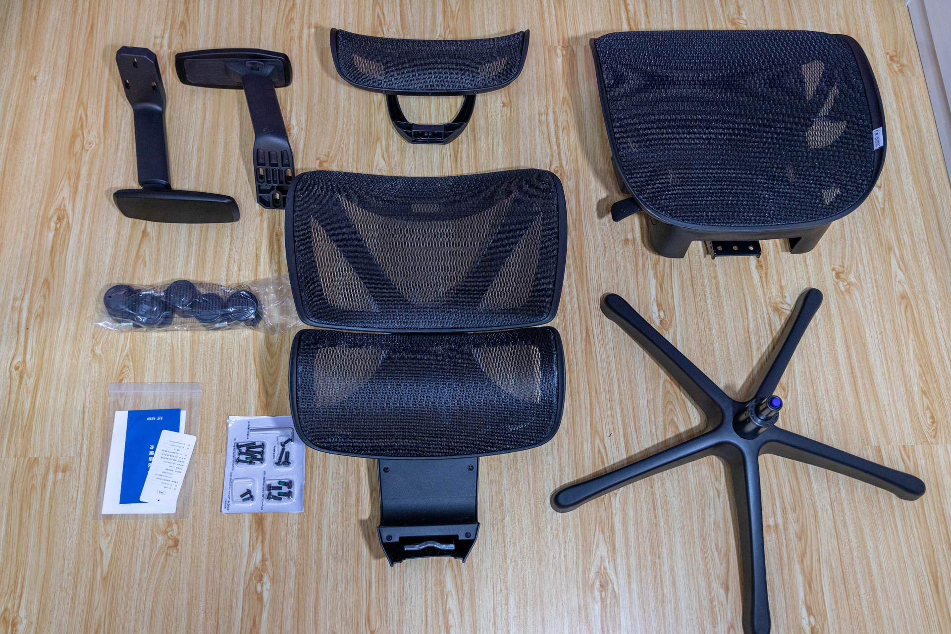 黑色头枕一个,黑色背部靠垫一个,黑色坐垫一个,黑色扶手两个,黑色底架一个,黑色轮子五个,黑色螺丝一本,六棱简便螺丝刀一把,白色说明书一份。