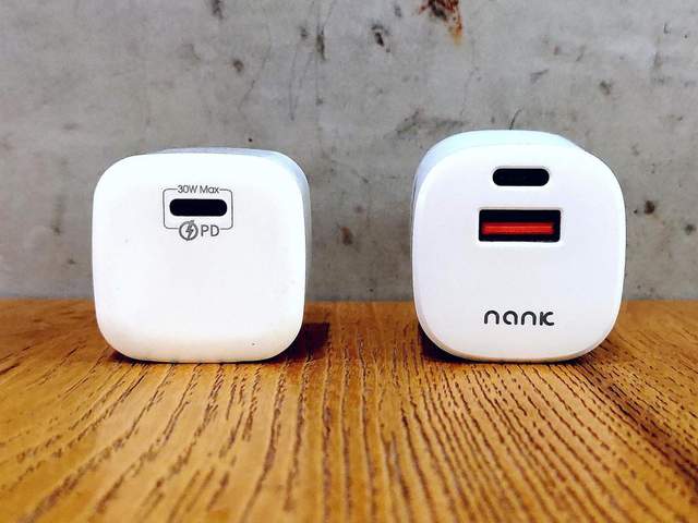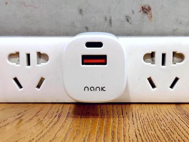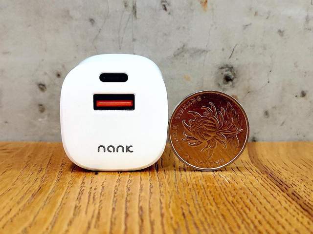 南卡20W迷你PD充电器正面上的尺寸大小略比一个1元硬币稍大少许,并且在这里带有“NANK”品牌logo的标识,同时还有别于同类型PD快速充电器,带来了USB-A和USB-C双接口,更加便于日常充电使用。