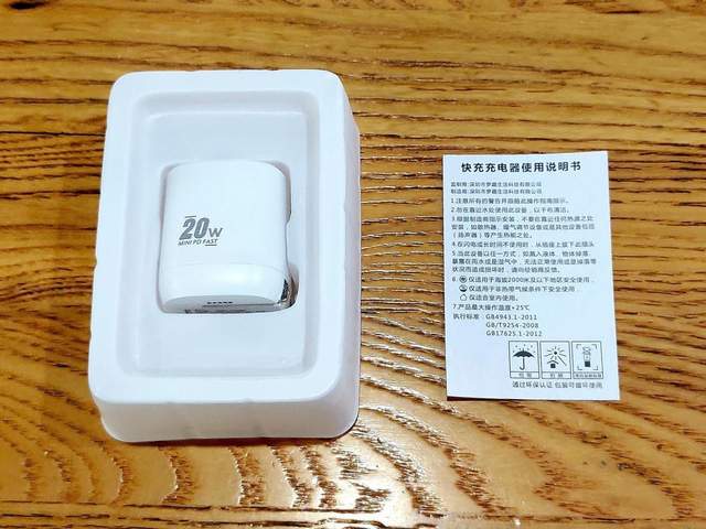打在南卡20W迷你PD充电器包装,把充电器和其他说明书等取出后,可以发现该款充电器包装内只含有充电器本体和《快充充电器使用说明书》两样东西,并没有随充电器附送任何充电数据线,需要搭配原装充电线或者另行选购使用。