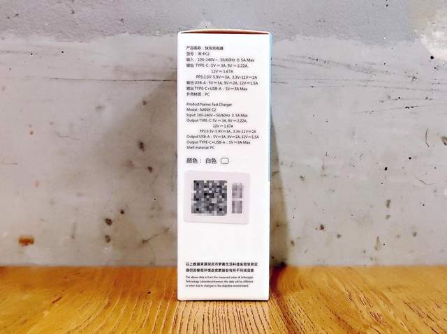 然而,南卡20W迷你PD充电器的产品参数,却以中英文的形式详细印刷在包装的右侧面上,并且还附带有南卡一贯如一地具有的“中国商品信息验证中心”的防伪二维码,为消费者选购正品产品带来了质量保障。