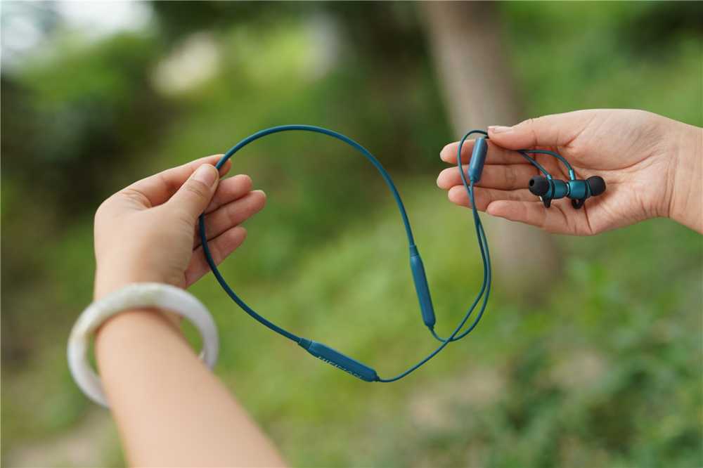 HIFIMAN BW400颈挂式蓝牙耳机采用柔性项圈设计,外出携带的时候可以团放在一起,以此节约更多的收纳空间,音频线也非常柔韧,自己简单的拉扯过,感觉韧性和强度都能够满足日常使用和运动健身时候的需求。