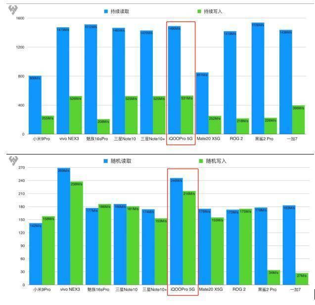 除此以外,iQOO Pro 5G版和NEX 3 5G还采用了目前市面上最顶级的闪存模式——UFS 3.0。它的读写速度分别可以达到1507MB/s和396MB/s。相比起USF 2.1,UFS 3.0的顺序读取速度更是提升了85%。值得一提的是,UFS 3.0的带宽会比UFS 2.1的更高,因此电压也变得更低,可以很好地提升手机的续航和散热性能。不得不说的是,iQOO Pro 5G版还支持全新的F2FS文件系统,可以有效地改善手机的读写性能。而从下面的这个对比图来看,我们可以得知采用了UFS 3.0和F2FS组合的iQOO Pro 5G版的表现远超于其他的主流手机,而同样采用了UFS 3.0的NEX 3 5G的表现也十分地突出。