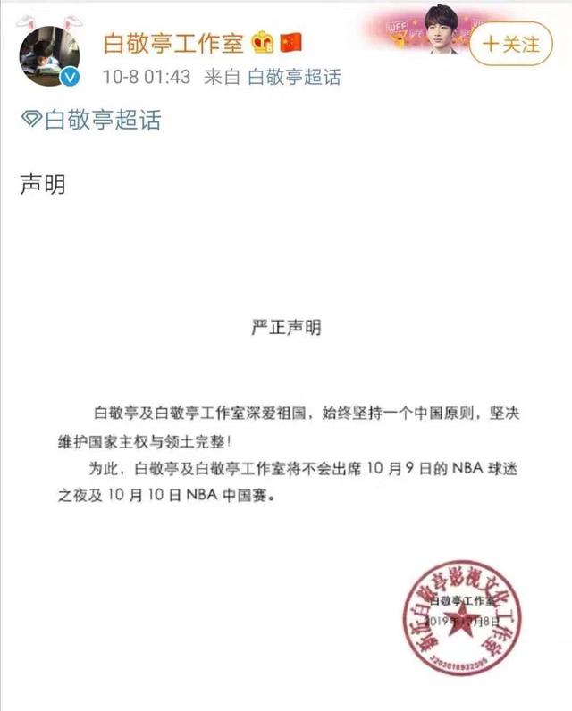 除此以外,白敬亭也发表了一份声明。白敬亭也坚守着一个中国的原则,坚决地维护国家主权和领土的完整。同时,白敬亭还表示将不会出席10月9日的NBA球迷之夜以及10月10日的NBA中国赛。而蔡徐坤、周一围以及郑云龙等明星也在微博中发布了自己的看法,表示将不会参与NBA的一切活动,并停止与NBA的合作。