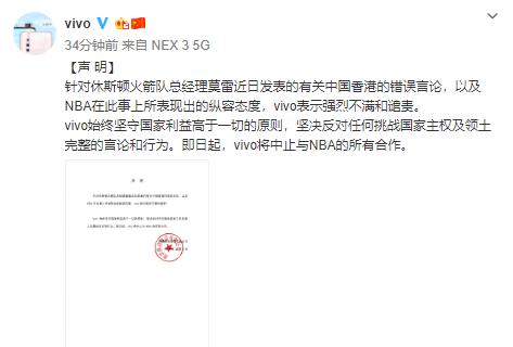 值得一提的是,还有许多品牌也解除了与NBA的合作关系。如安踏和vivo在得知莫雷此事件以外,便迅速地在微博中发布了与NBA停止合作的声明。尤其是vivo,更是对莫雷和NBA在此事件的态度表示强烈的不满及谴责。vivo一直以来都坚守着国家利益高于一切的原则,坚决地反对任何挑战国家主权以及领土完整的言论和行为。而作为与NBA合作最多的数码厂商,vivo近年来都与NBA有着十分密切的联系。但是当此事件发生以后,vivo还是毫不犹豫地选择了祖国,将合作放一边先。因此,一众网友们都为vivo的此举进行点赞,认为vivo很好地体现了大厂的风范。