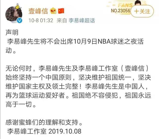 因此,我国的很多艺人在得知此消息以后,都迅速地表明了自己的立场。如当红明星李易峰就在微博中表示将不会出席10月9日的NBA球迷之夜的活动。同时表示在无论何时,都始终坚持一个中国的原则,坚持维护国家主权以及领土完整。李易峰认为完美的祖国永远高于一切,是绝对不容侵犯的。