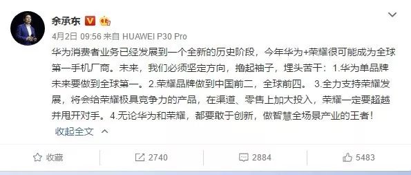图:余承东为荣耀定下中国前二、全球前四的目标