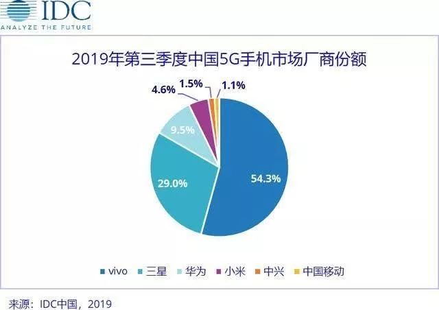 抢先布局也带来了市场份额上的领先。根据调研机构IDC公布的2019年第三季度中国5G手机出货量报告显示,今年第三季度中国5G手机整体出货量约48.5万部,其中vivo以54.3%的市场份额排名第一,小米则排名第四。虽然华为排名第三,但依靠的是华为Mate 20 X 5G这款产品,当时荣耀还并未发布5G手机。