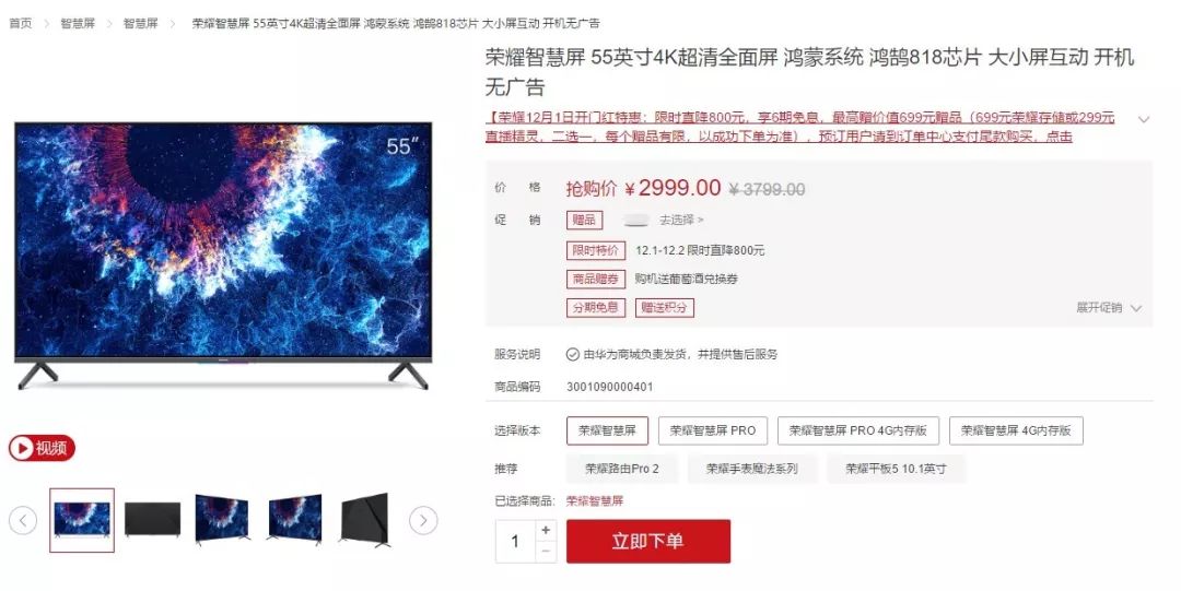 起初,55英寸的荣耀智慧屏和荣耀智慧屏PRO分别售价3799元和4799元,但目前价格已经分别降至2999元和3999元,分别跌破3000元和4000元大关。
